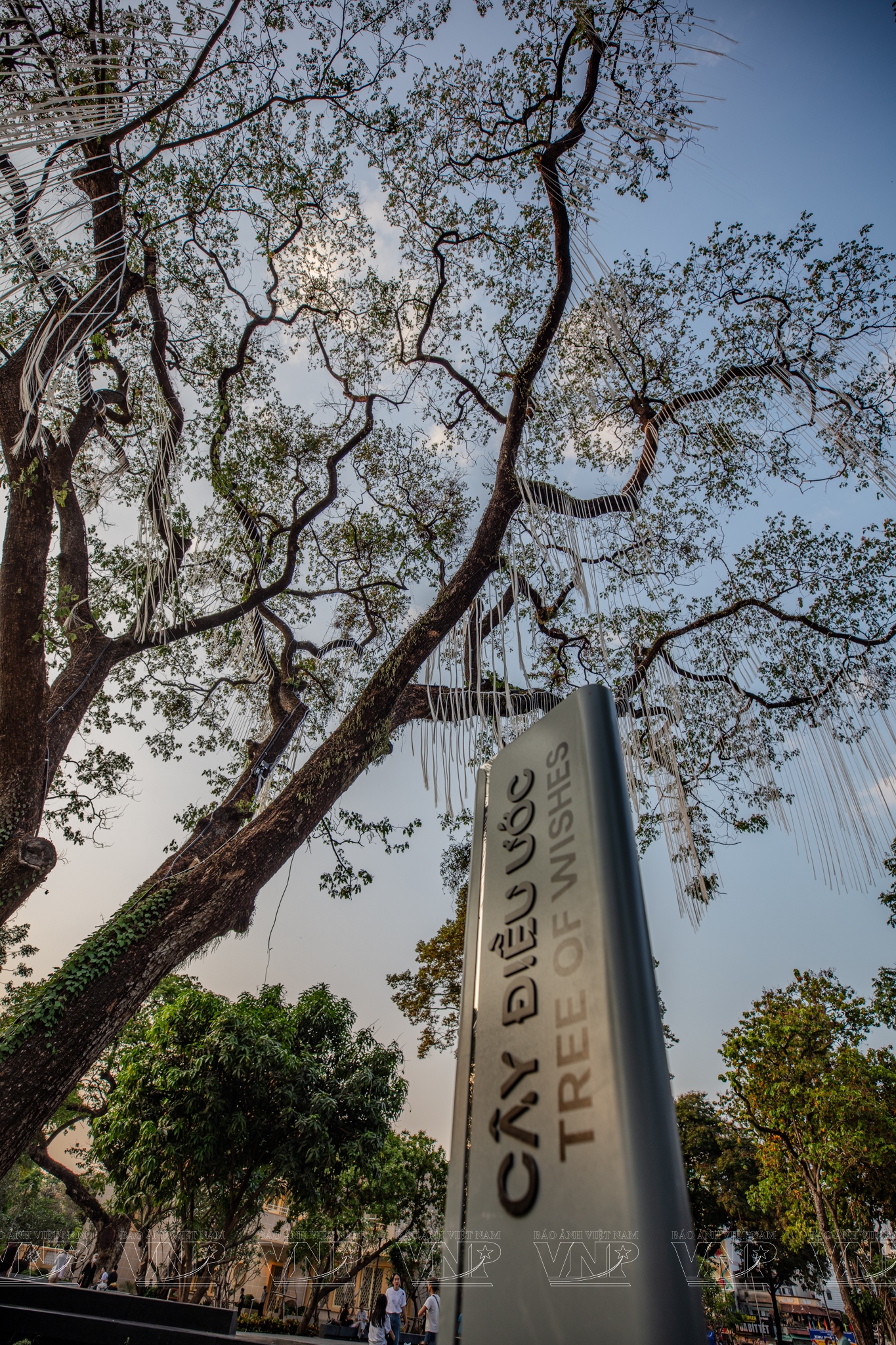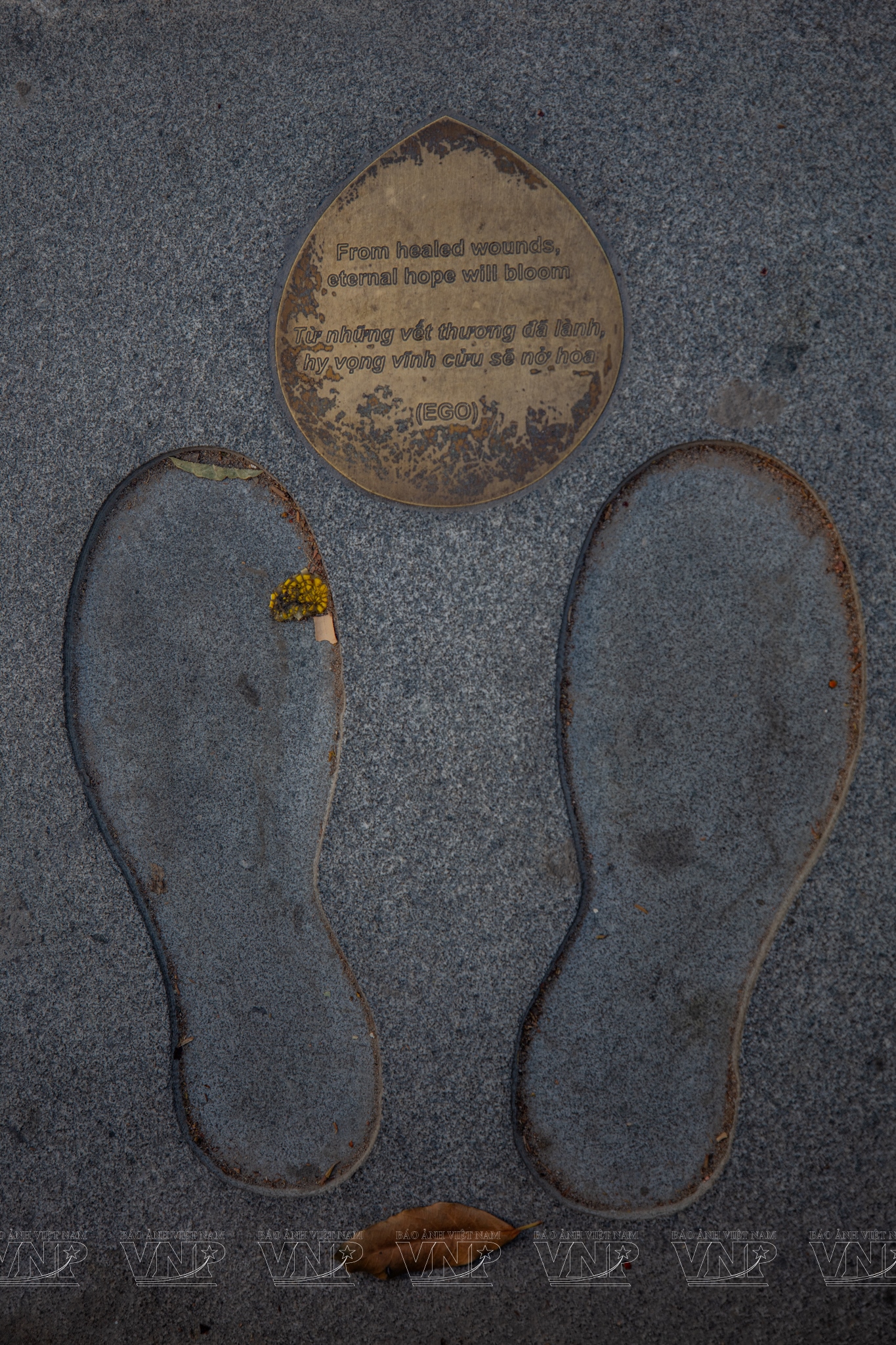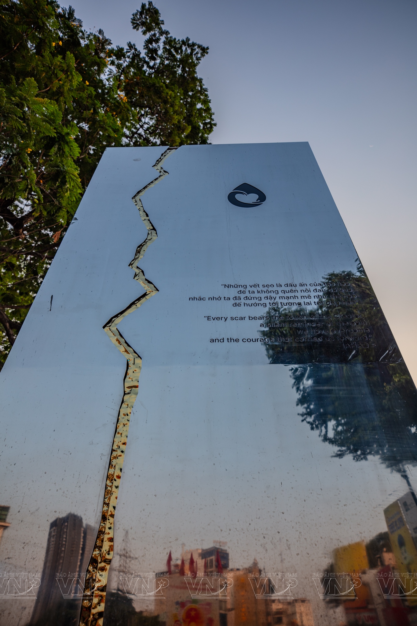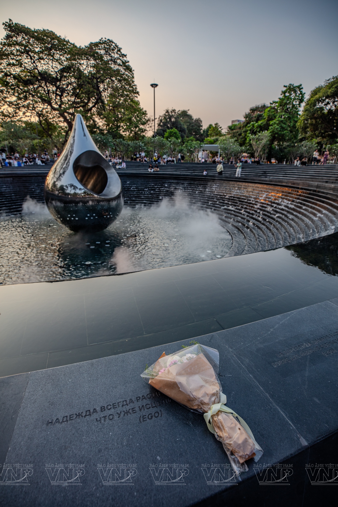 Dưới bóng những hàng cổ thụ được giữ gìn nguyên vẹn, công viên hiện lên trầm mặc khi chiều buông. Trung tâm quảng trường là tượng đài “Giọt nước” cao 6m, đúc bằng inox nguyên khối mài bóng. Phần lõi hình trái tim là một khoảng rỗng phản chiếu bầu trời rộng mở, như biểu tượng cho nhịp đập yêu thương và sự gắn kết bền chặt của cộng đồng. Gần đó, “Cây điều ước” với hàng ngàn dải ruy băng trắng khẽ lay trong gió, tựa những lời cầu nguyện thầm lặng gửi đến người đã khuất. Dưới mỗi bước chân, những dấu in bằng đồng trên nền đá khắc ghi thông điệp: “Từ những vết thương đã lành, hy vọng vĩnh cửu sẽ nở hoa”.