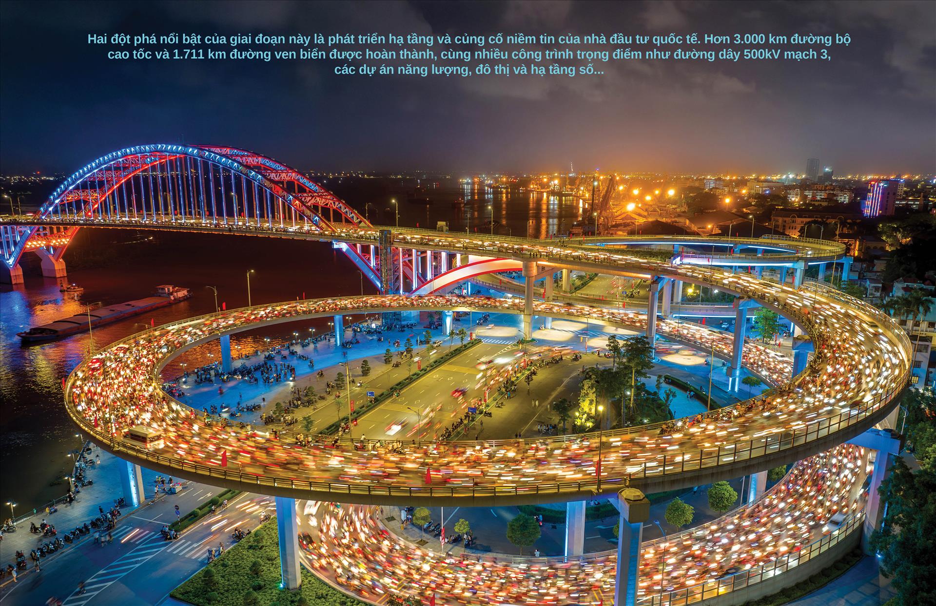 Hai đột phá nổi bật của giai đoạn này là phát triển hạ tầng và củng cố niềm tin của nhà đầu tư quốc tế. Hơn 3.000 km đường bộ cao tốc và 1.711 km đường ven biển được hoàn thành, cùng nhiều công trình trọng điểm như đường dây 500kV mạch 3, các dự án năng lượng, đô thị và hạ tầng số. Tốc độ Internet di động của Việt Nam hiện thuộc top 20 thế giới, tạo nền tảng quan trọng cho kinh tế số. Trong bối cảnh dòng vốn FDI toàn cầu chững lại, Việt Nam vẫn duy trì mức giải ngân cao, khẳng định sức hấp dẫn của môi trường đầu tư và triển vọng dài hạn.