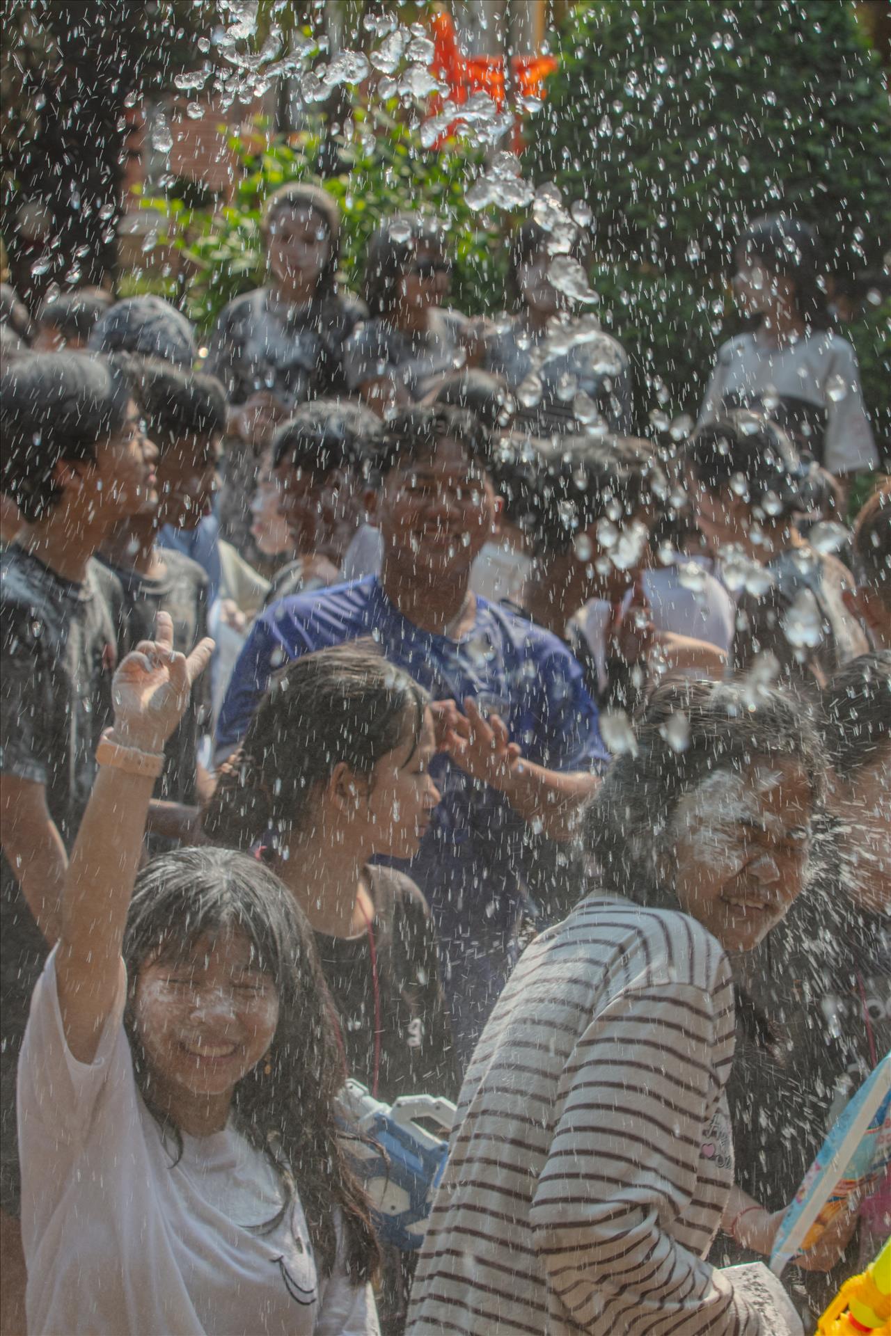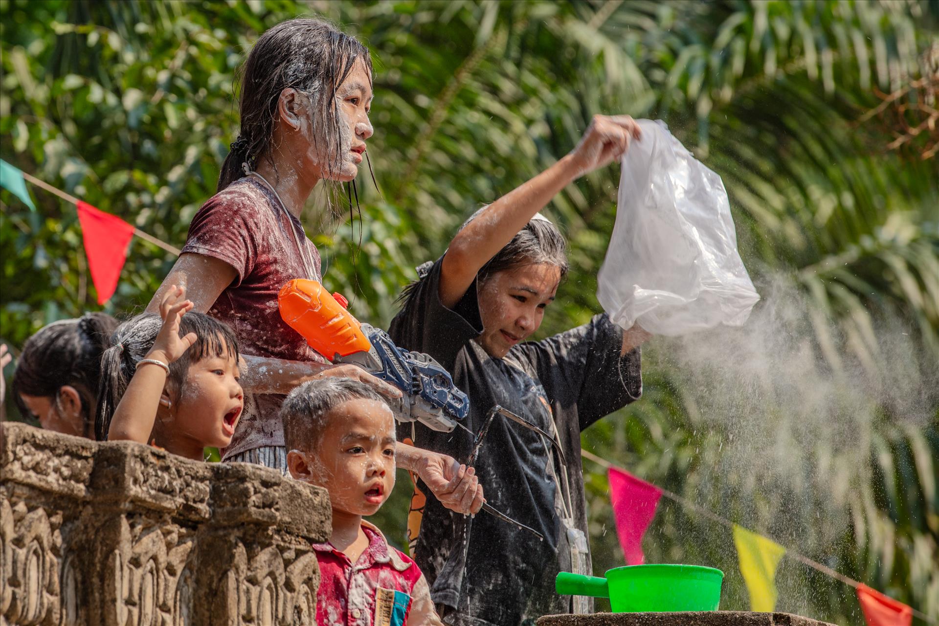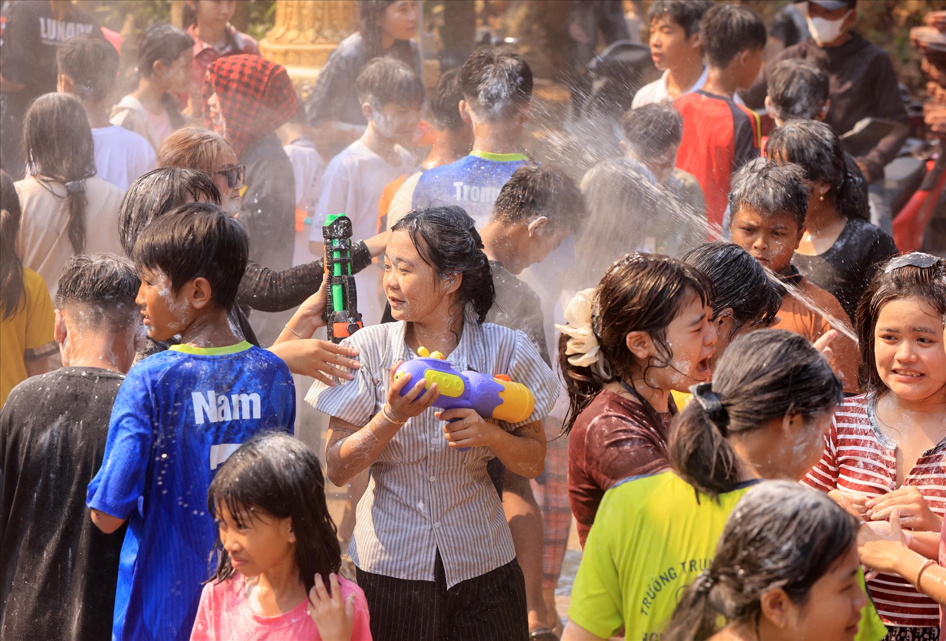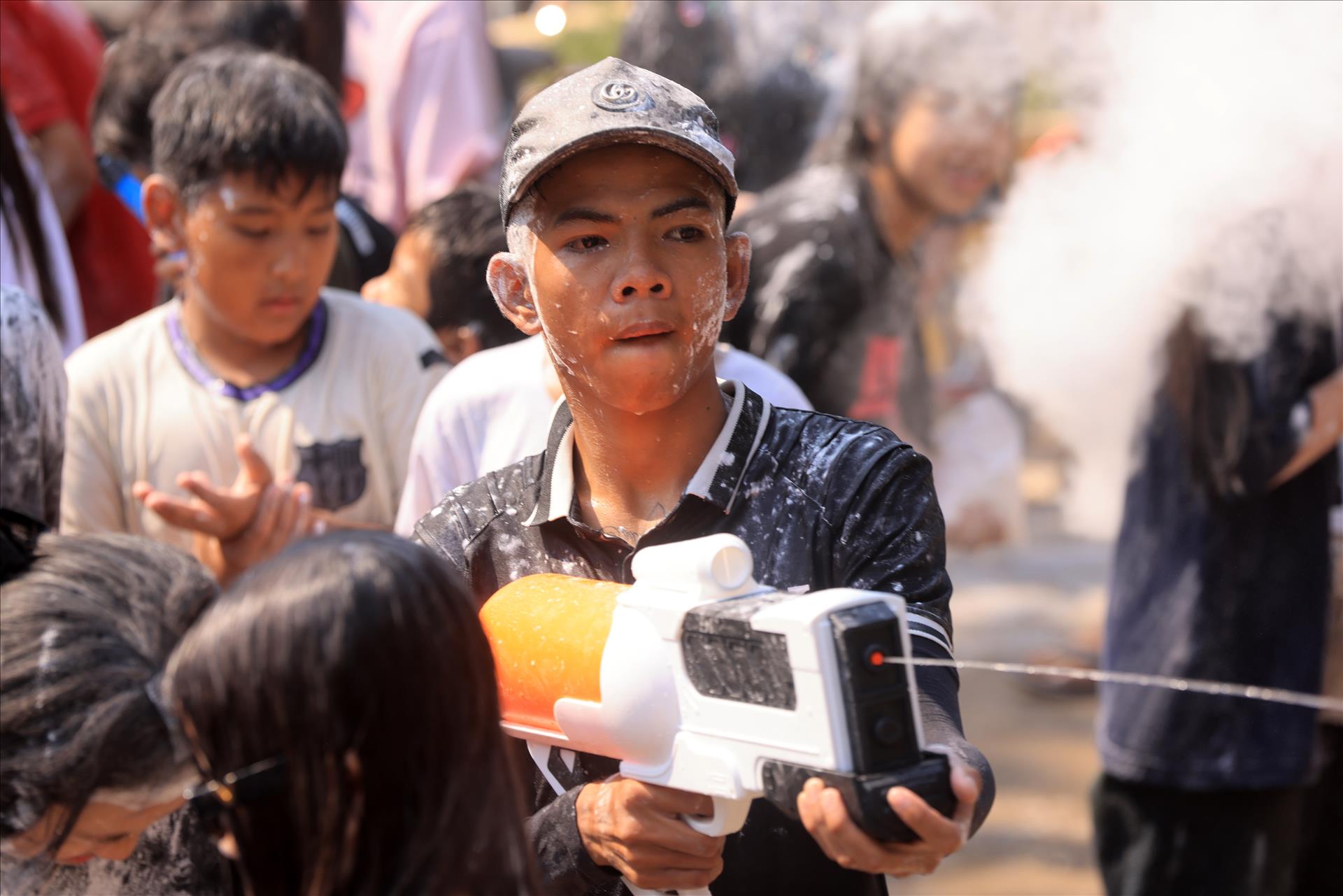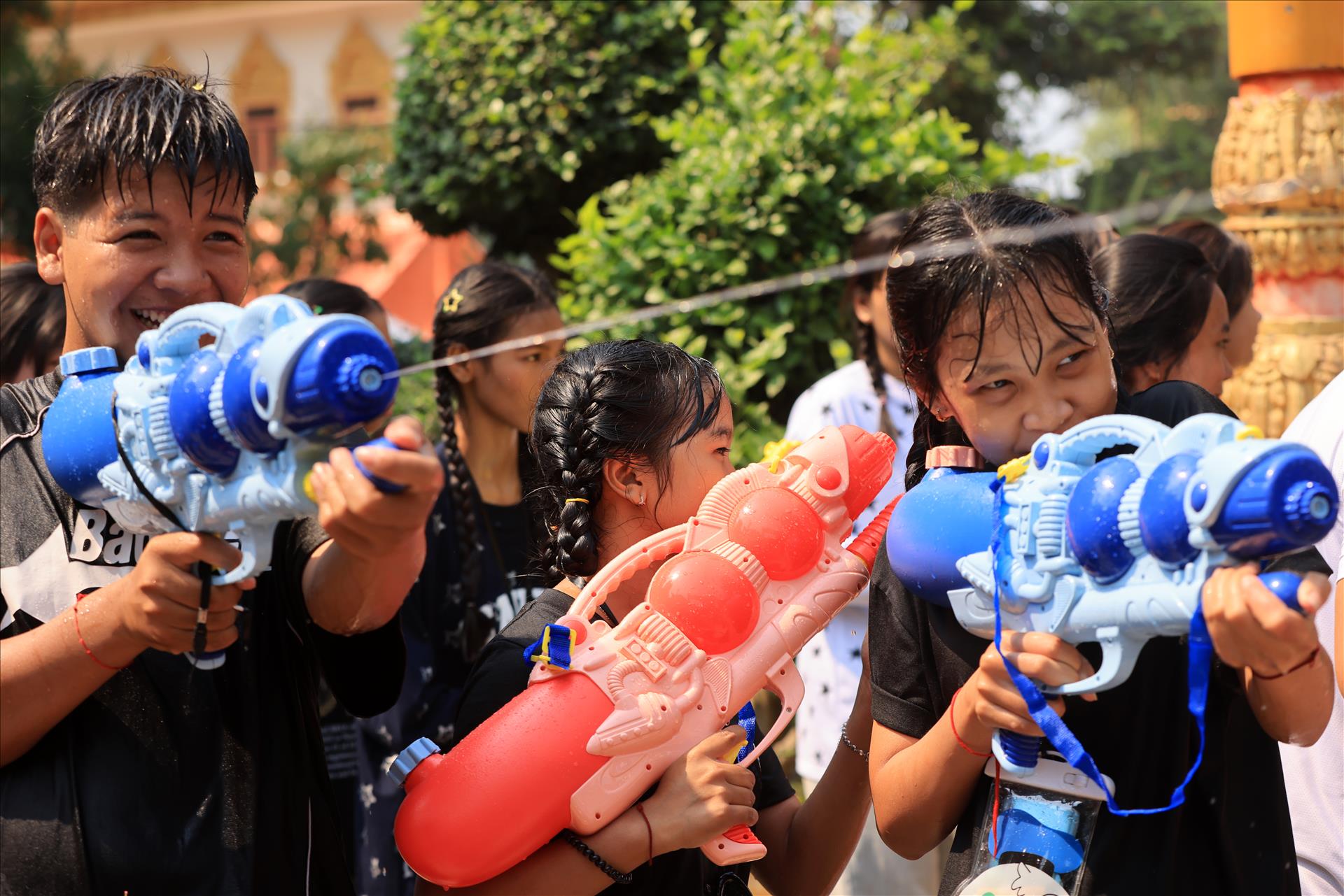 Từ khoảng giữa trưa, khuôn viên chùa trở nên sôi động với sự tham gia đông đảo của thanh thiếu niên và trẻ nhỏ. Những màn té nước diễn ra liên tục trong tiếng cười rộn rã. Không chỉ sử dụng các dụng cụ quen thuộc như ca, xô hay gáo nước, nhiều em nhỏ còn mang theo súng nước, biến hoạt động này thành một trò chơi vui nhộn, tạo nên những khoảnh khắc sinh động giữa không gian lễ hội. Những dòng nước được trao đi không mang tính đối kháng mà như một lời chúc bình an, thuận lợi trong năm mới.