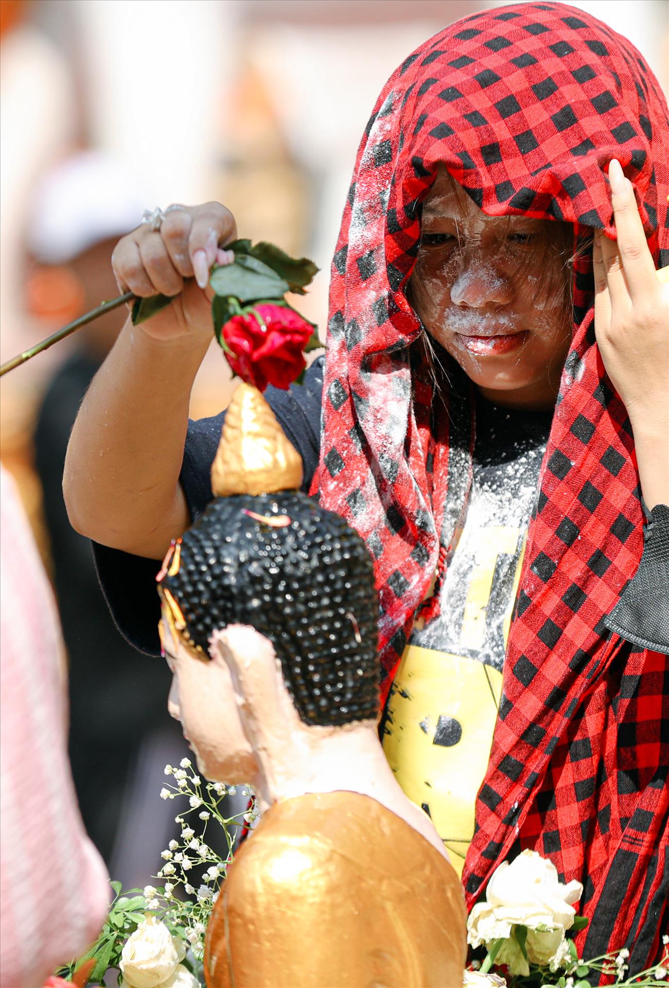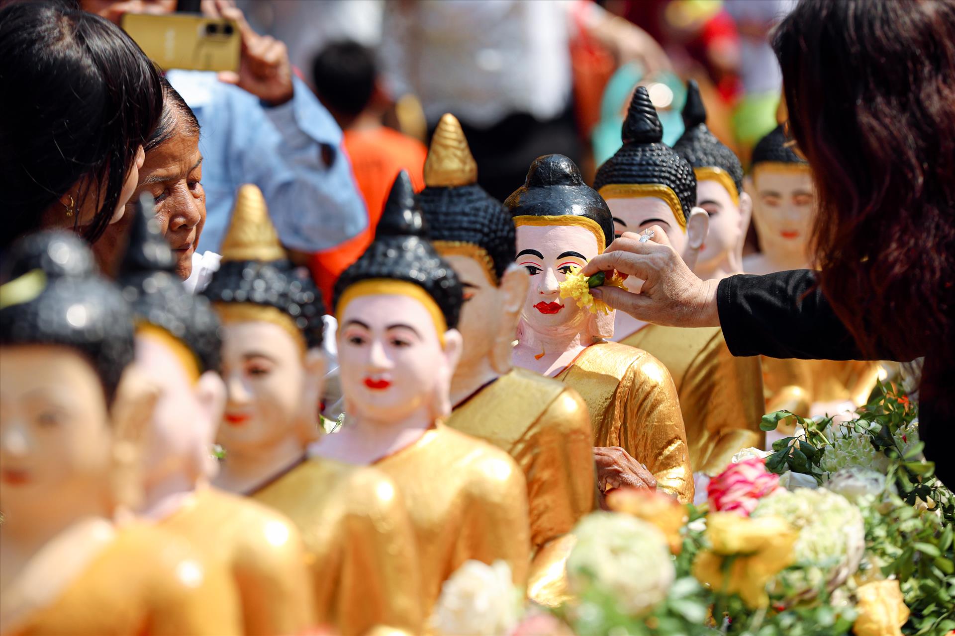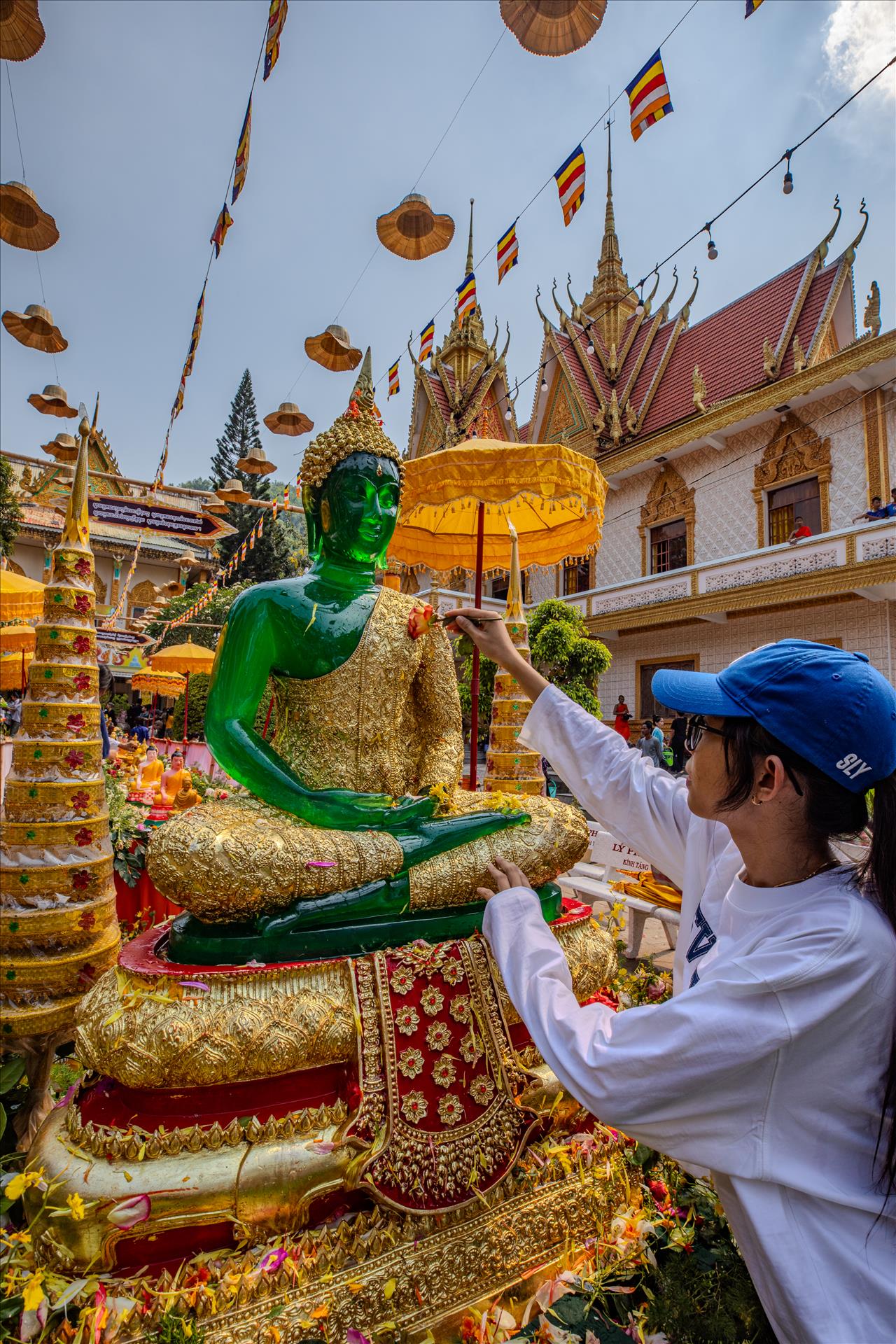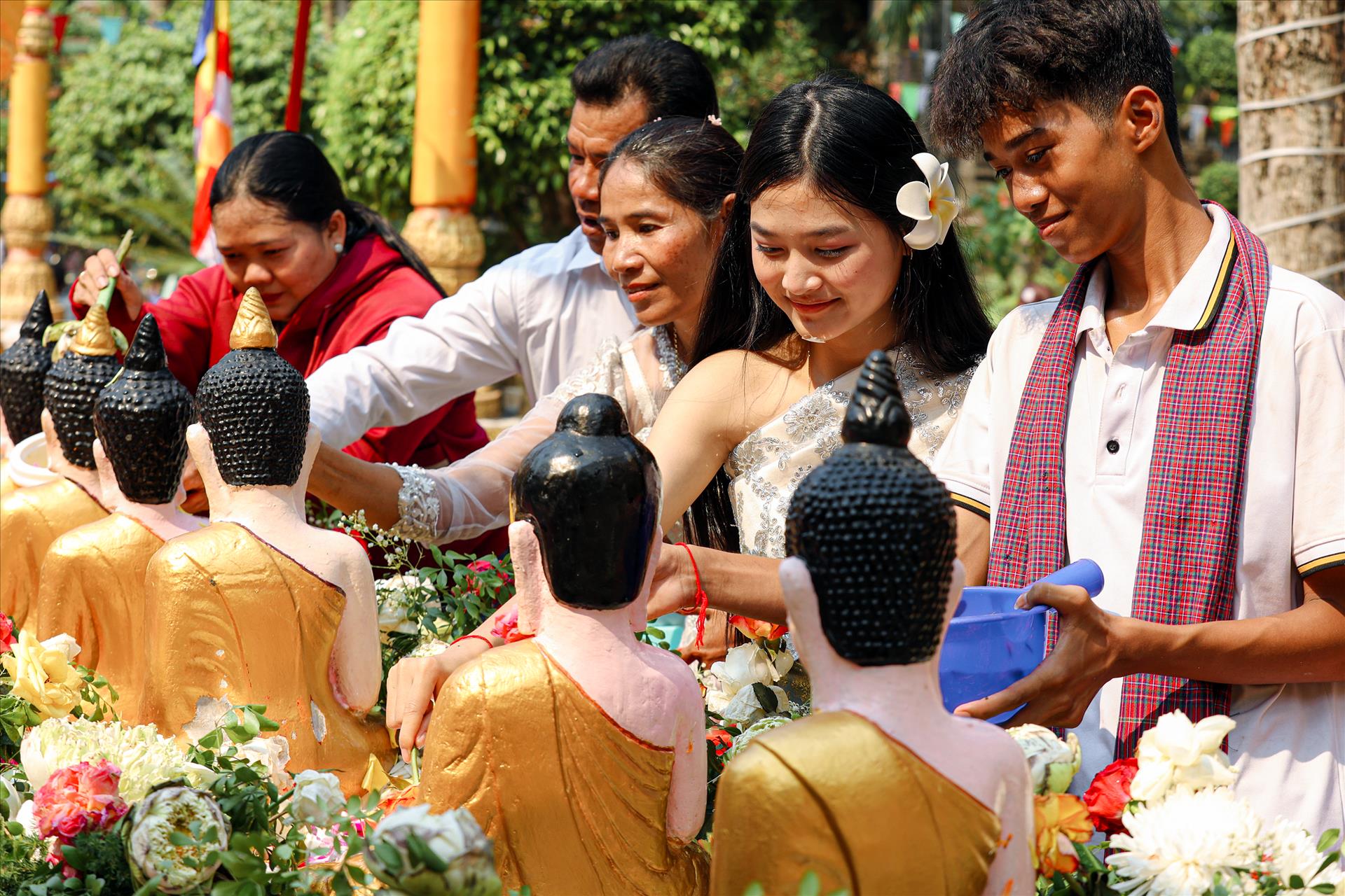 Nghi lễ tắm Phật đã thu hút đông đảo người Khmer trong vùng Óc Eo tham gia. Các gia đình, nhóm bạn cùng nhau dâng lễ, cầu chúc năm mới bình an. Trong nghi thức tắm Phật, người dân lần lượt dâng nước thơm lên tượng Phật với sự thành kính. Theo quan niệm Phật giáo Nam tông Khmer, nghi thức này mang ý nghĩa thanh tẩy, hướng con người đến những giá trị tốt đẹp trong năm mới. Đây cũng là điểm nhấn quan trọng, thu hút đông đảo người dân tham gia.