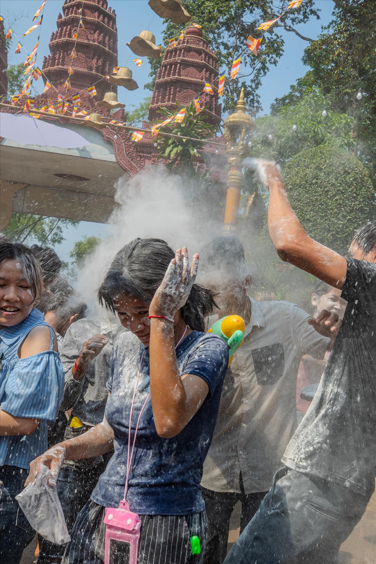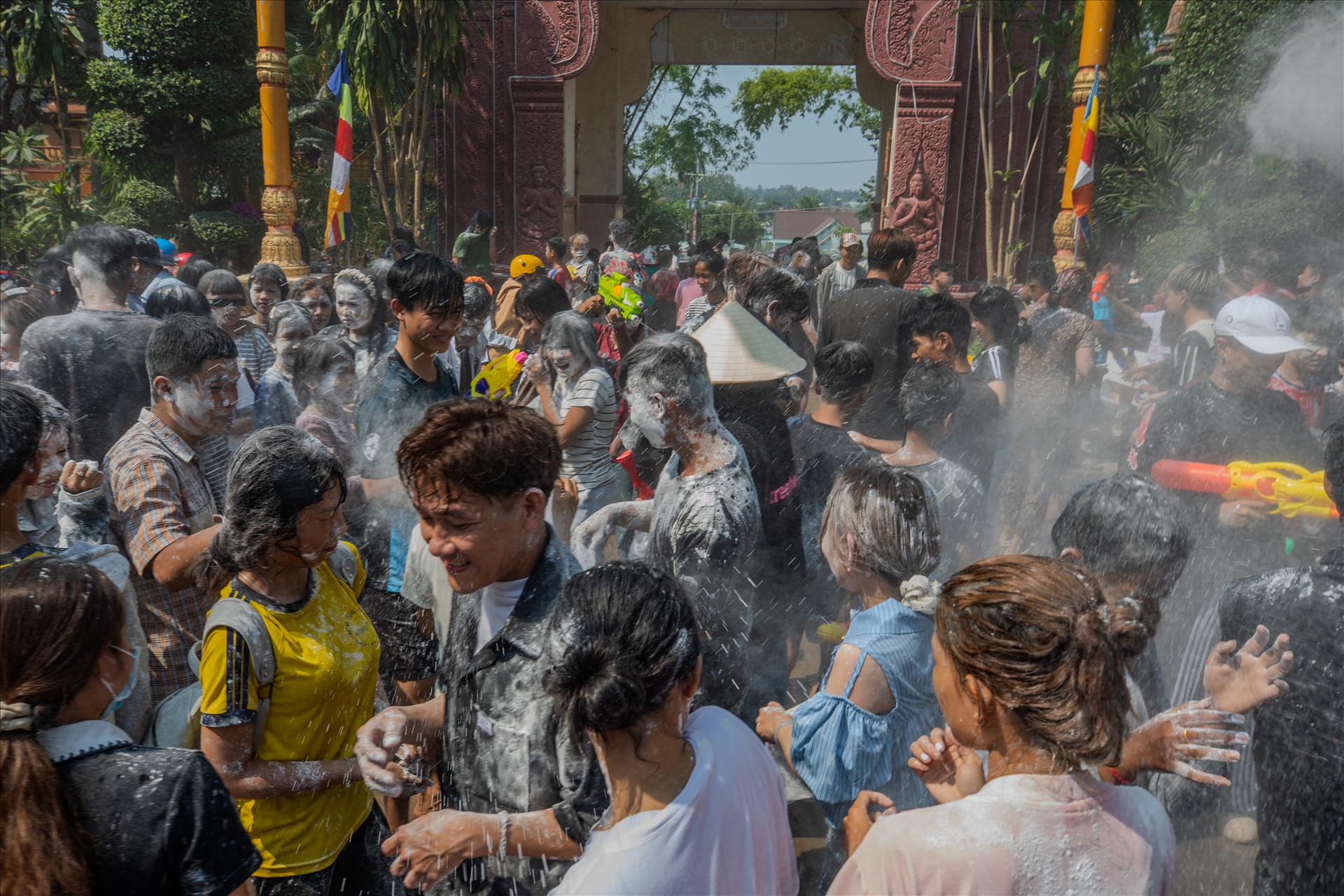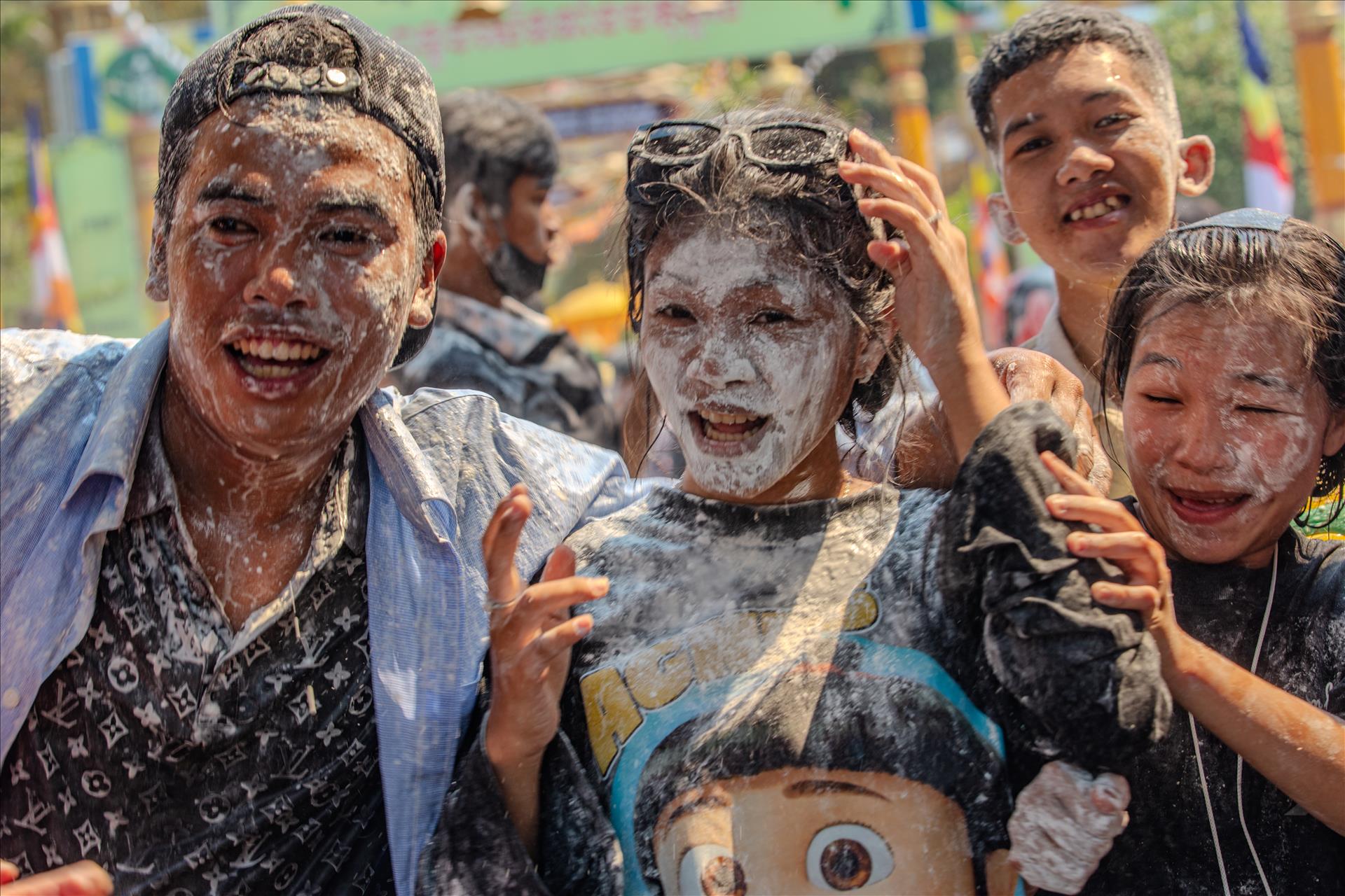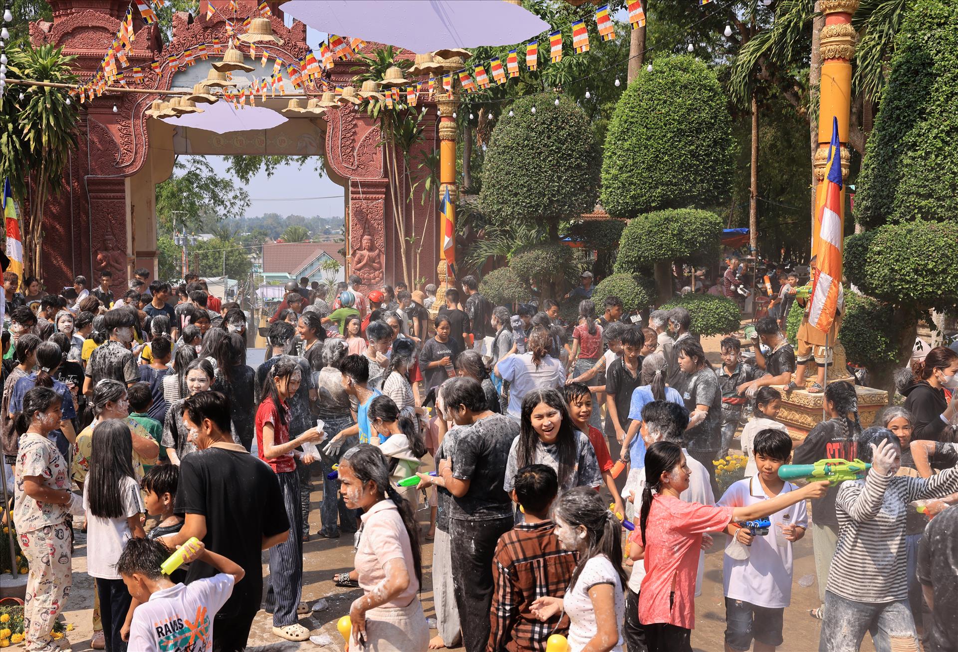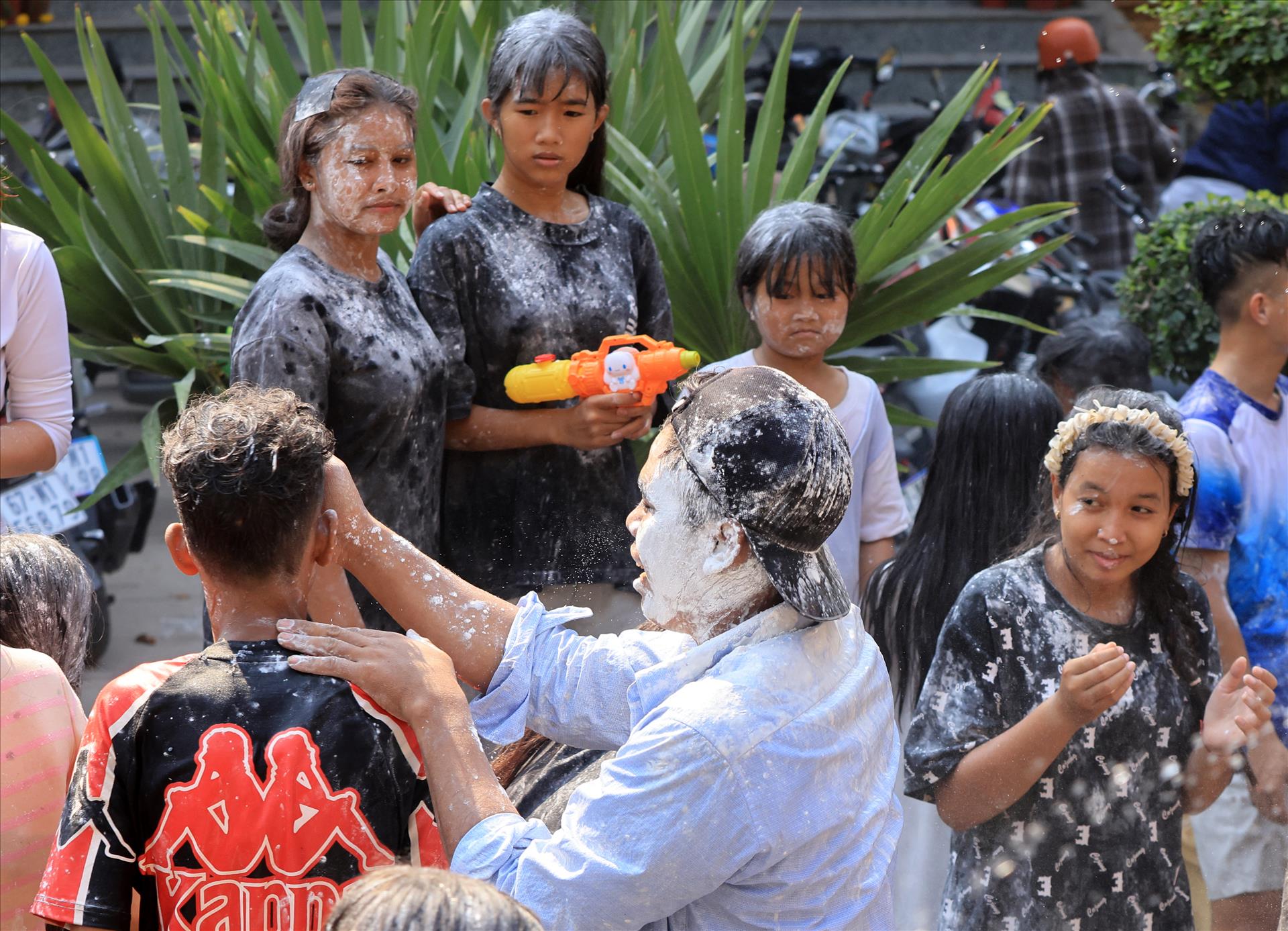 Sau phần lễ, không gian chùa chuyển sang các hoạt động mang tính cộng đồng. Hoạt động té nước diễn ra sôi nổi, tạo không khí vui tươi, gắn kết giữa những người tham gia. Bên cạnh đó, trò ném bột – chủ yếu do thanh thiếu niên thực hiện – góp phần tạo nên những tương tác gần gũi. Những nắm bột trắng được tung nhẹ, không mang tính đối kháng mà thể hiện ý nghĩa chúc phúc, may mắn trong năm mới.