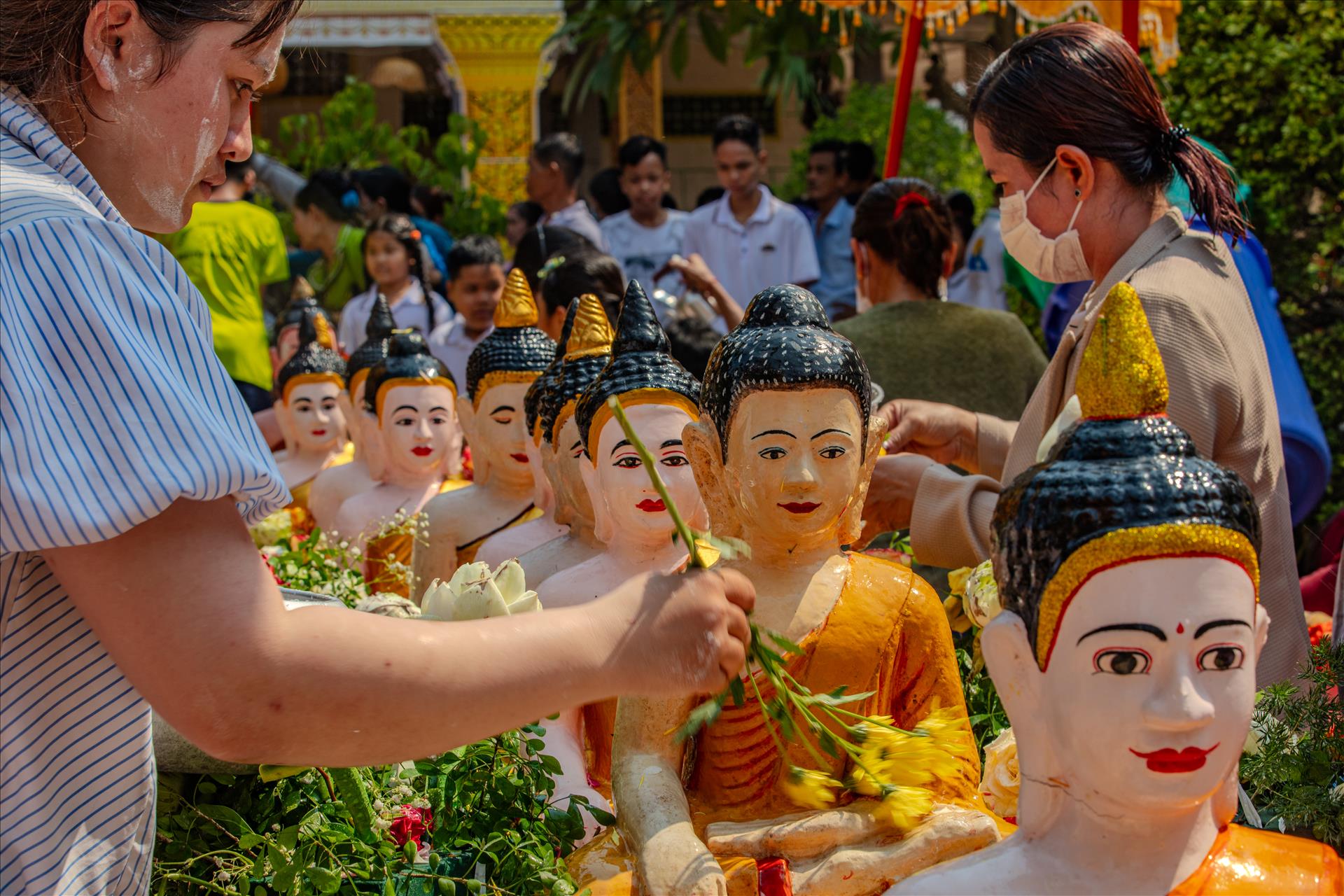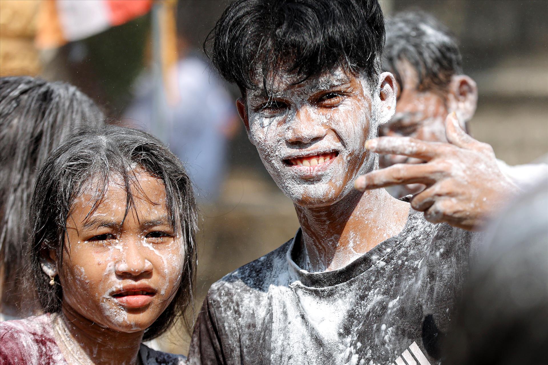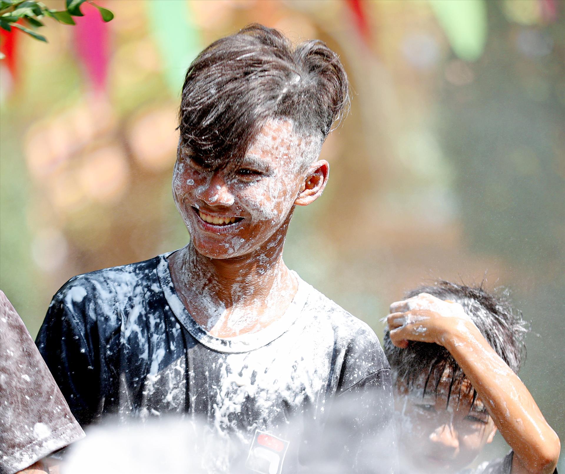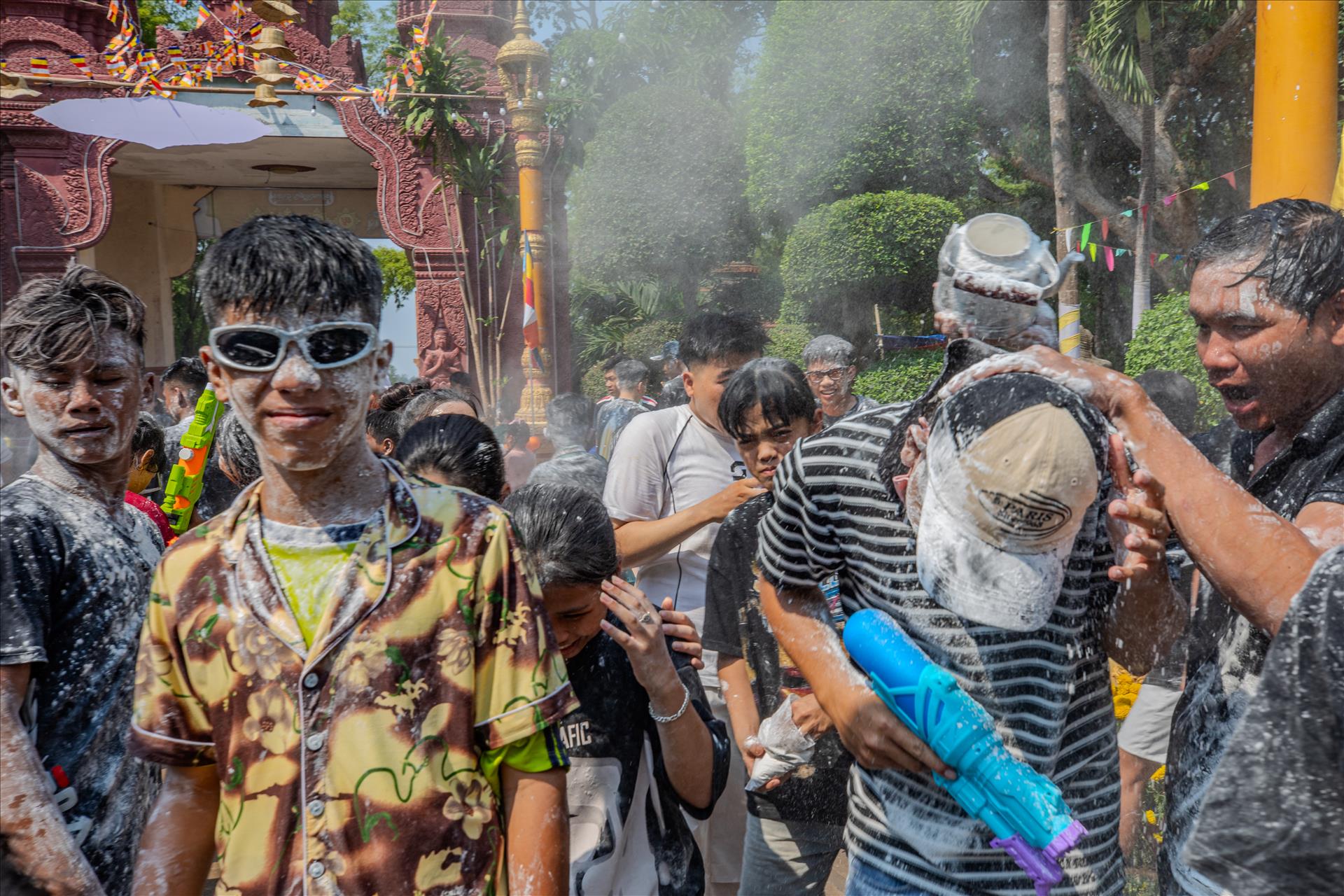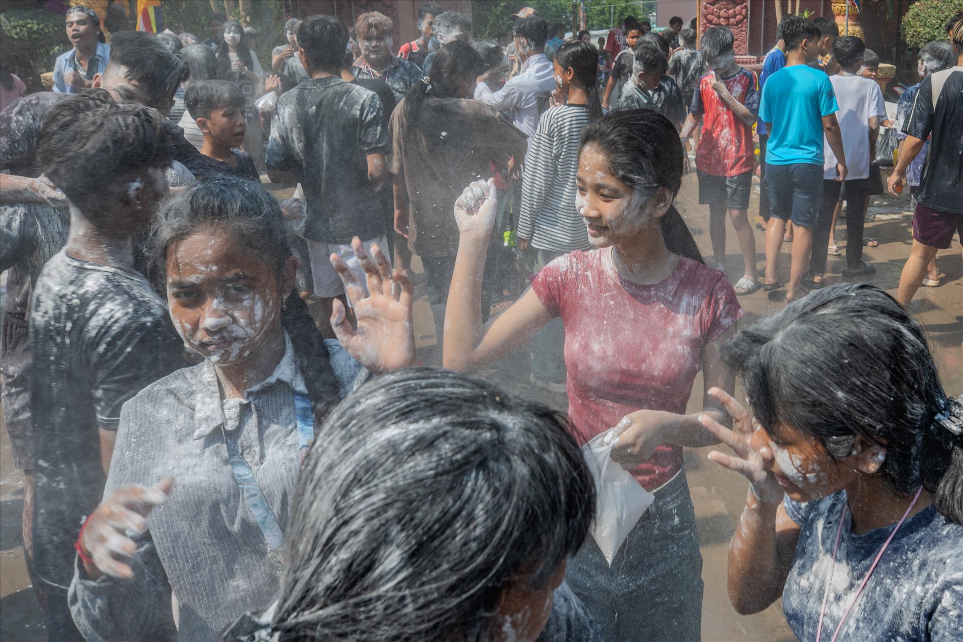 Sau phần lễ, không gian chùa chuyển sang các hoạt động mang tính cộng đồng. Hoạt động té nước diễn ra sôi nổi, tạo không khí vui tươi, gắn kết giữa những người tham gia. Bên cạnh đó, trò ném bột – chủ yếu do thanh thiếu niên thực hiện – góp phần tạo nên những tương tác gần gũi. Những nắm bột trắng được tung nhẹ, không mang tính đối kháng mà thể hiện ý nghĩa chúc phúc, may mắn trong năm mới.