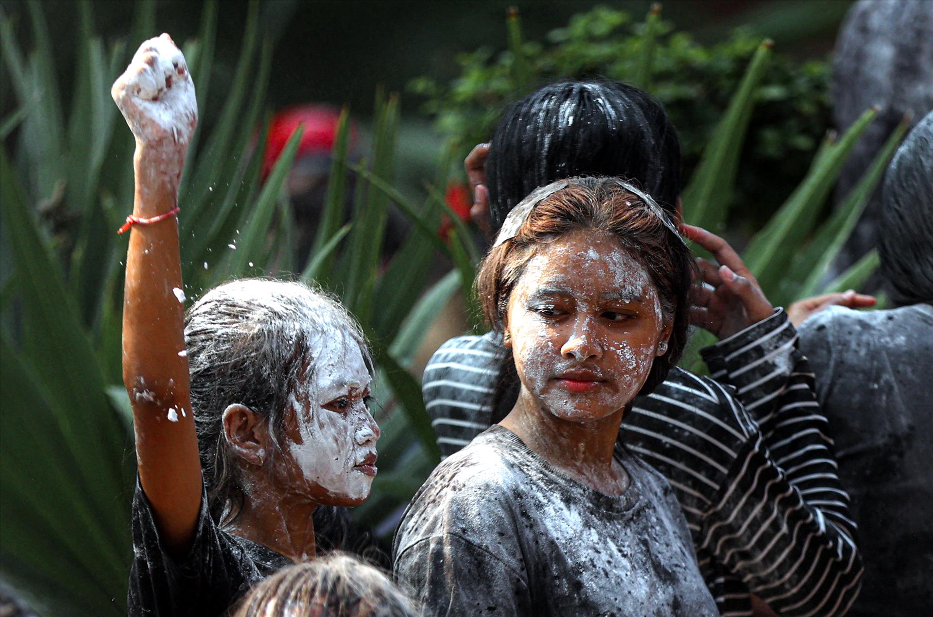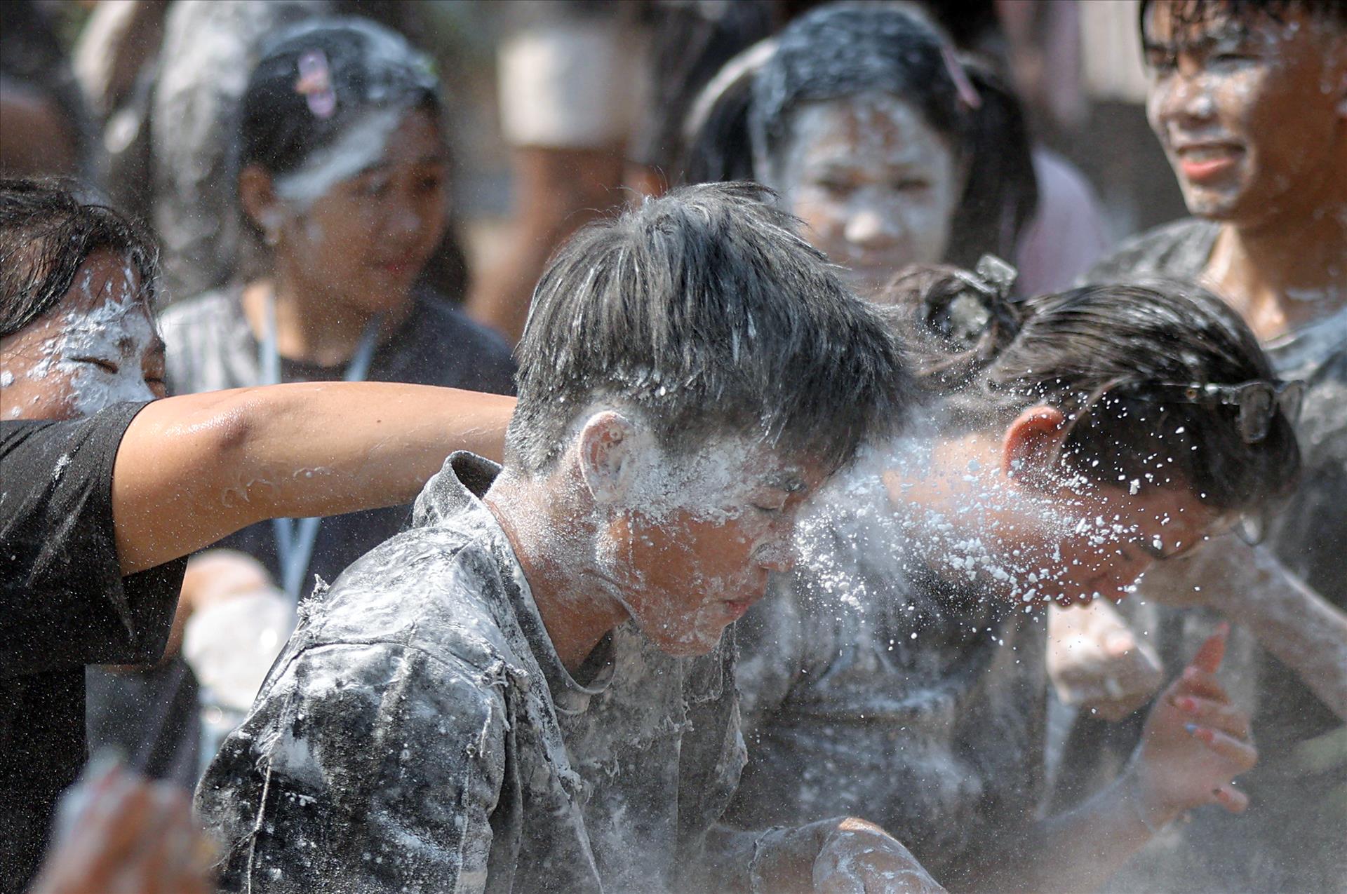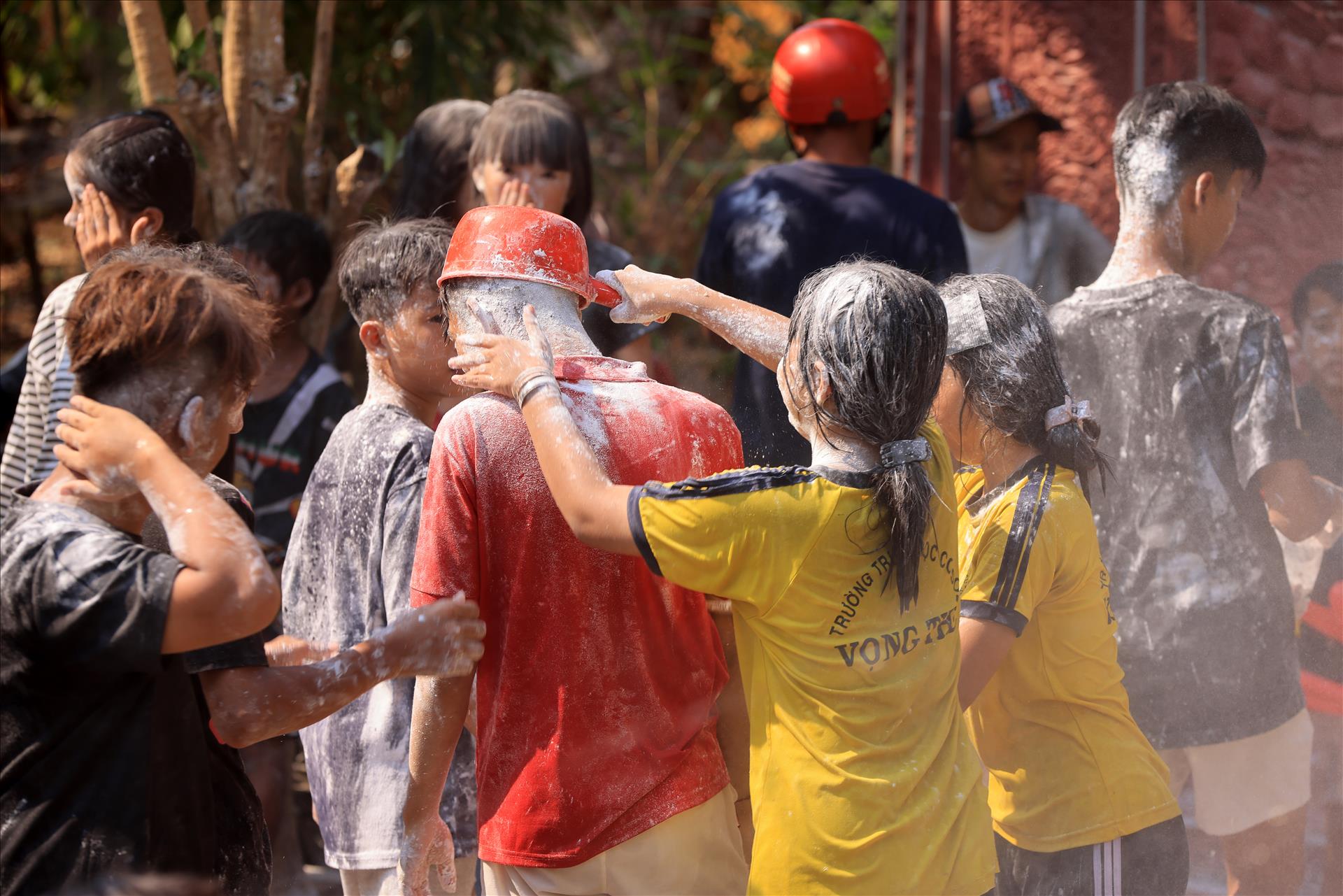 Song song với đó, hoạt động ném bột cũng thu hút đông đảo người tham gia. Những nắm bột trắng được tung nhẹ, phủ lên vai áo, mái tóc trong không khí thân thiện, gần gũi. Theo quan niệm dân gian, lớp bột trắng tượng trưng cho sự tinh khiết, góp phần xua đi những điều không may và mang lại điều tốt lành. Không gian vì thế càng thêm rộn ràng với những tiếng cười, khi mỗi hành động đều trở thành một cách thức giao lưu, kết nối giữa những người tham gia.