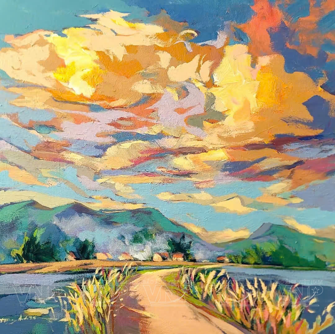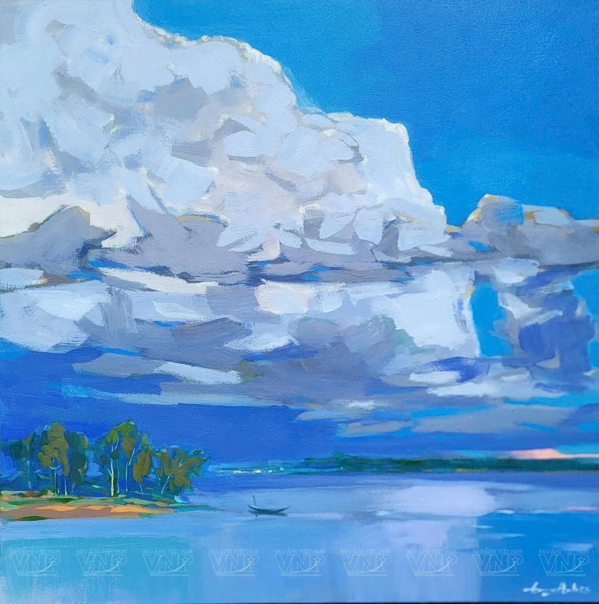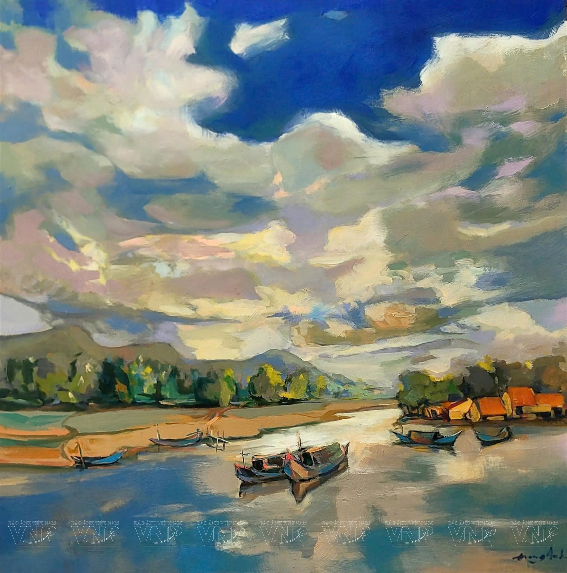 Một điều thú vị nữa là tranh phong cảnh của Vũ Trọng Anh rất nhiều mây, những đám mây nhiều lớp lang, màu sắc hiện lên rờ rỡ như muốn tương tác, lay động khung cảnh bình yên, trầm lắng ở bên dưới. Sự sắp đặt ấy dường như là một chủ đích của tác giả khi muốn thể hiện một tâm trạng, một nỗi niềm nào đó đang ẩn tàng trong kí ức, nhất là kí ức của một người nghệ sĩ xa xứ với giấc mơ phiêu lãng như những đám mây trời kia.