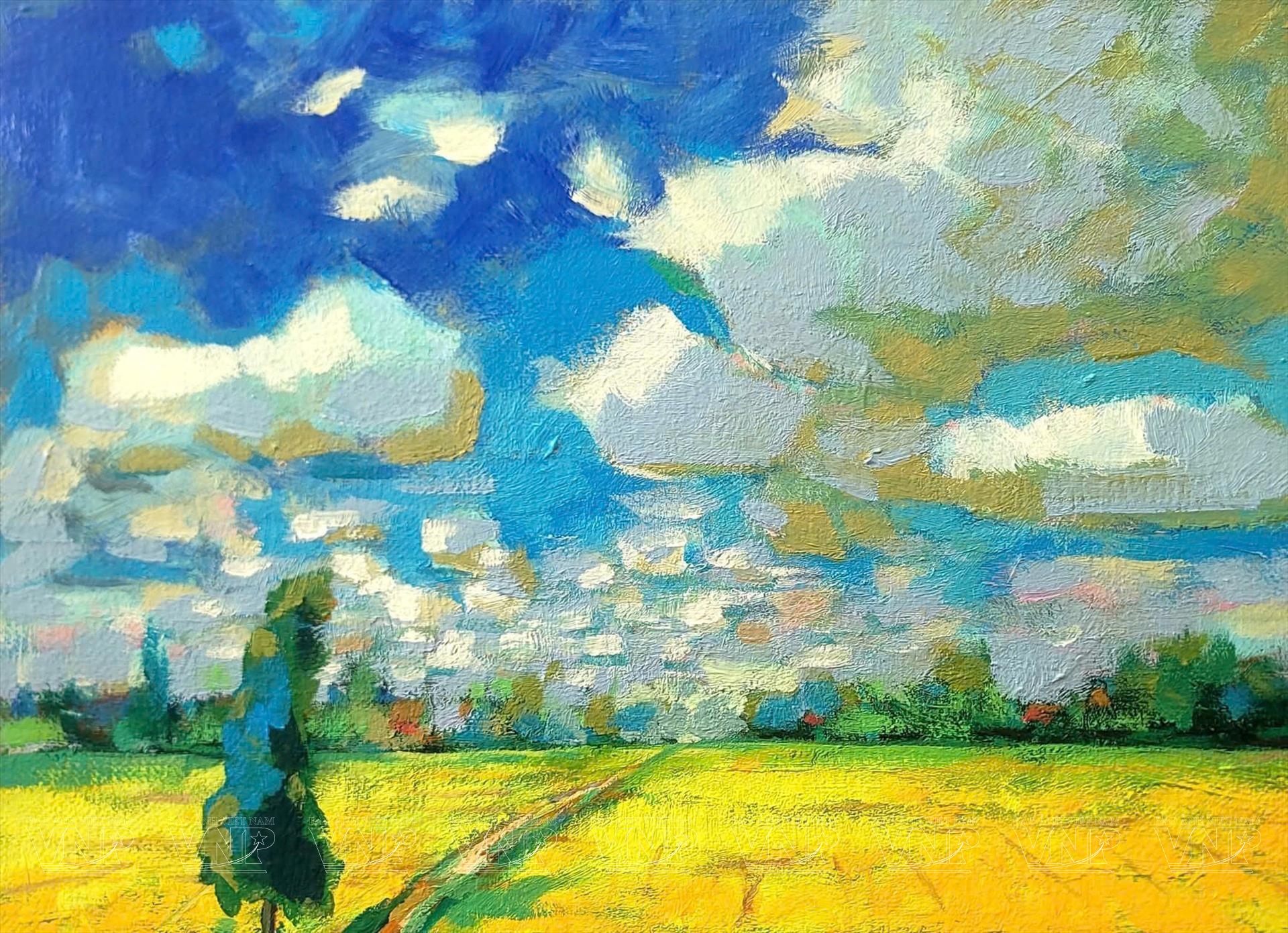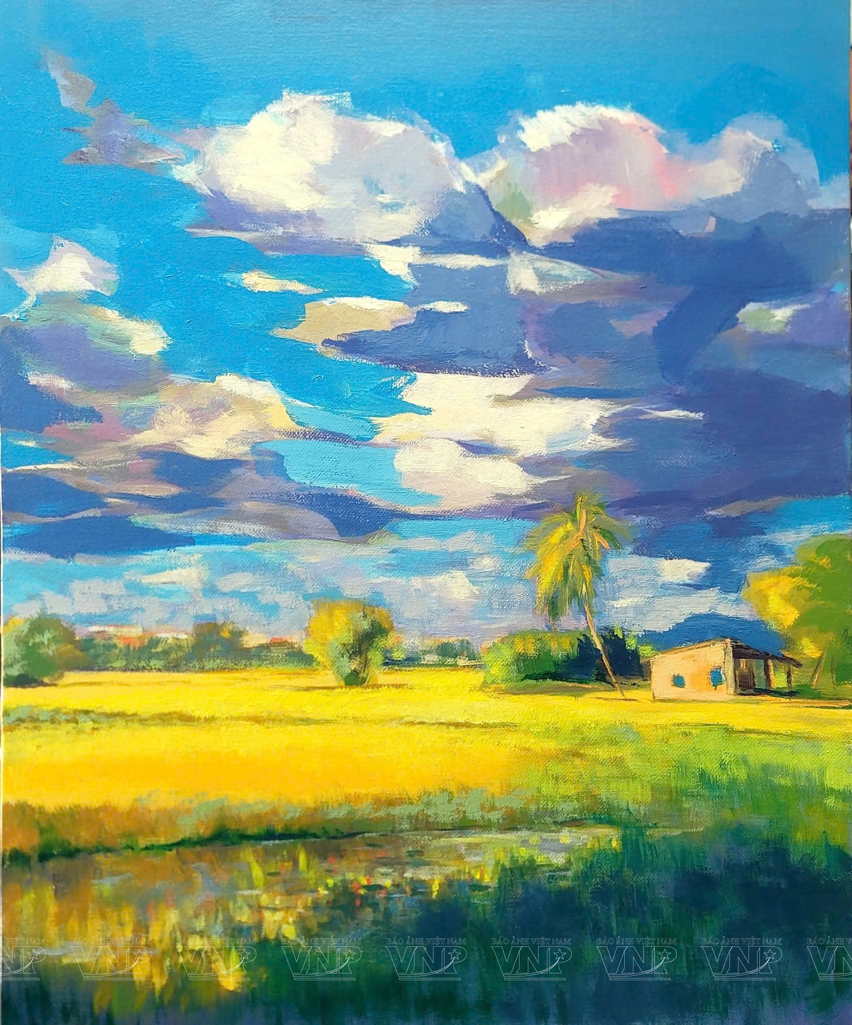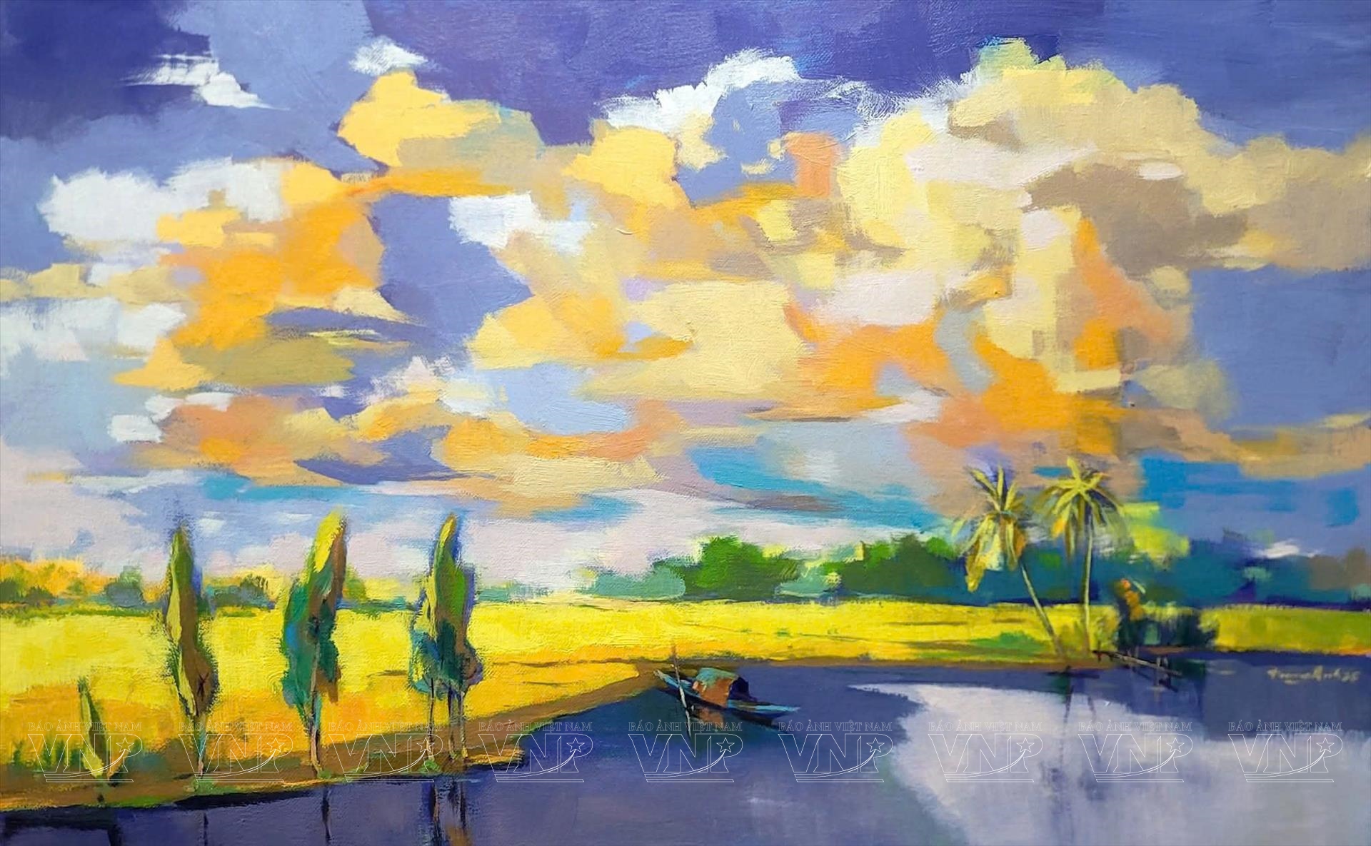 Một điều thú vị nữa là tranh phong cảnh của Vũ Trọng Anh rất nhiều mây, những đám mây nhiều lớp lang, màu sắc hiện lên rờ rỡ như muốn tương tác, lay động khung cảnh bình yên, trầm lắng ở bên dưới. Sự sắp đặt ấy dường như là một chủ đích của tác giả khi muốn thể hiện một tâm trạng, một nỗi niềm nào đó đang ẩn tàng trong kí ức, nhất là kí ức của một người nghệ sĩ xa xứ với giấc mơ phiêu lãng như những đám mây trời kia.