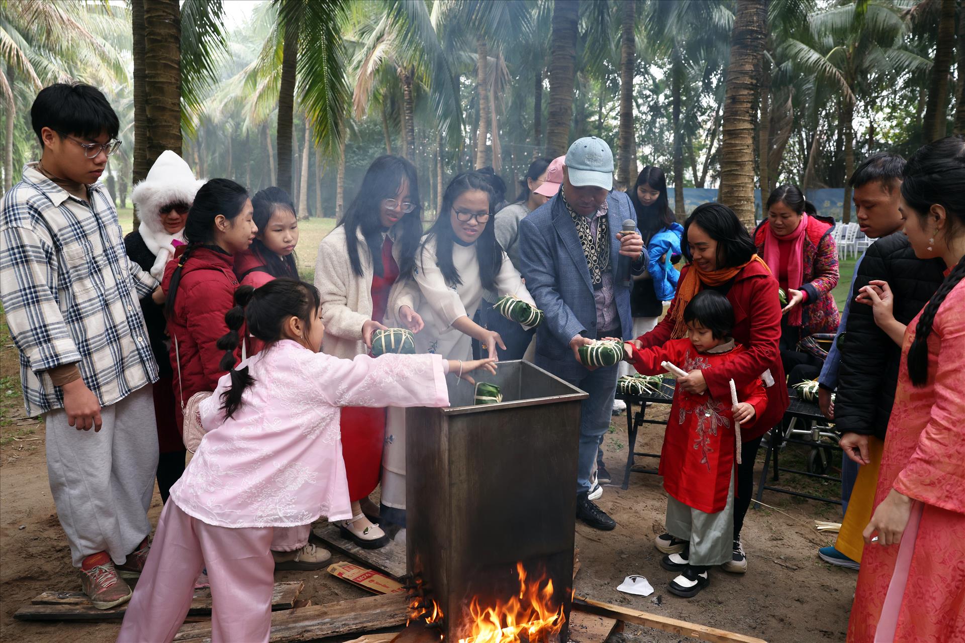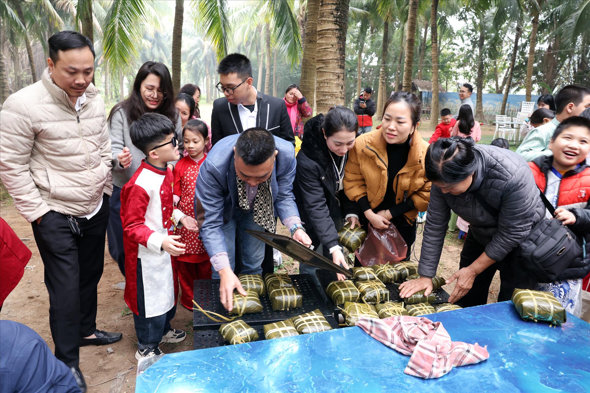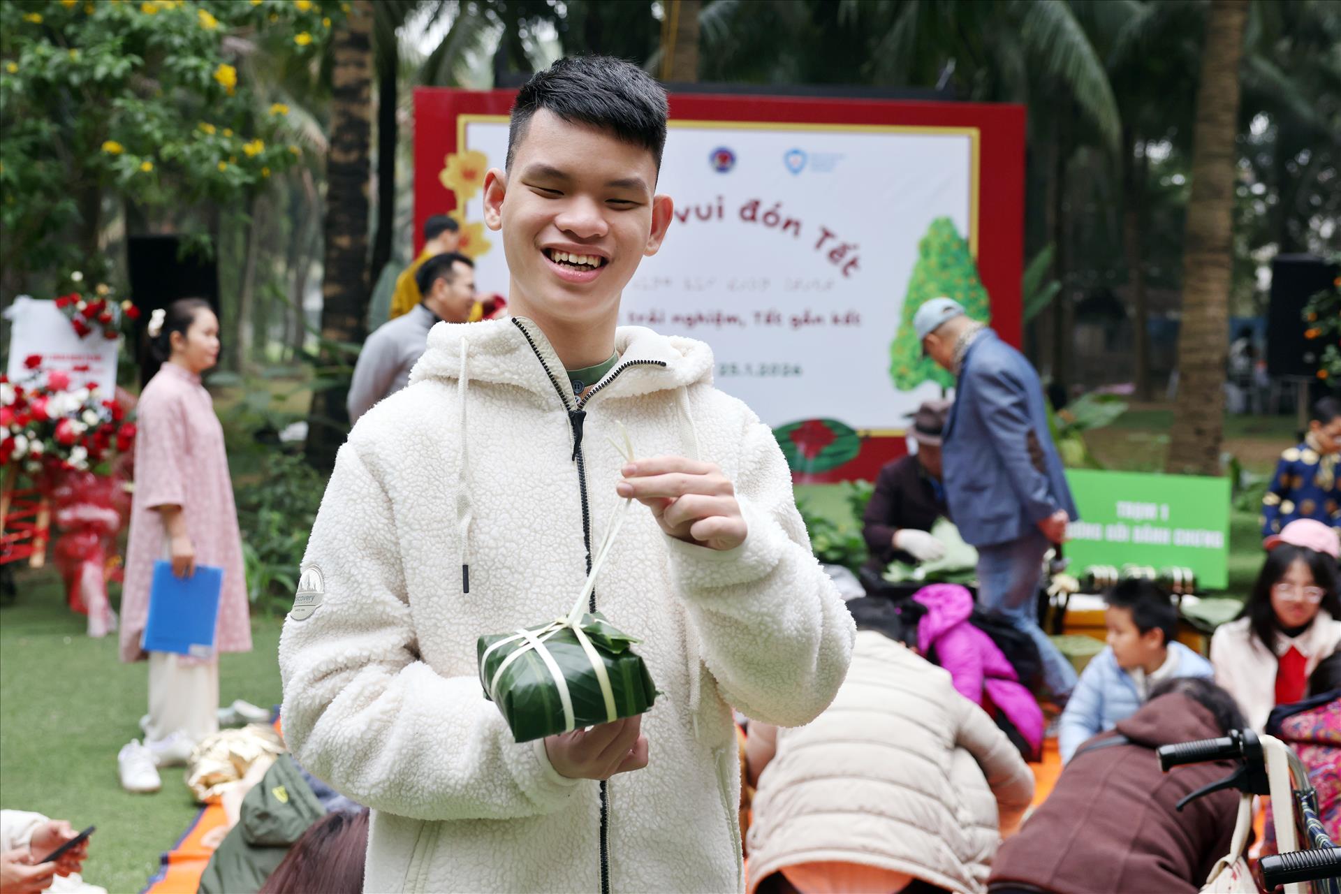 Ngay từ buổi sáng, không gian chương trình đã rộn ràng với 5 hoạt động trải nghiệm chính, được thiết kế phù hợp với trẻ khiếm thị, chú trọng vào xúc giác, thính giác và sự tương tác trực tiếp. Hoạt động gói bánh chưng và luộc bánh chưng mở đầu ngày hội trong bầu không khí đậm chất Tết cổ truyền. Những chiếc lá dong, hạt gạo nếp, đậu xanh, thịt mỡ được các em chạm tay, cảm nhận và lắng nghe hướng dẫn tỉ mỉ từ phụ huynh, tình nguyện viên. Mỗi công đoạn, dù nhỏ, đều mang lại sự háo hức, giúp các em hiểu hơn về ý nghĩa của chiếc bánh chưng – biểu tượng của ngày Tết Việt.