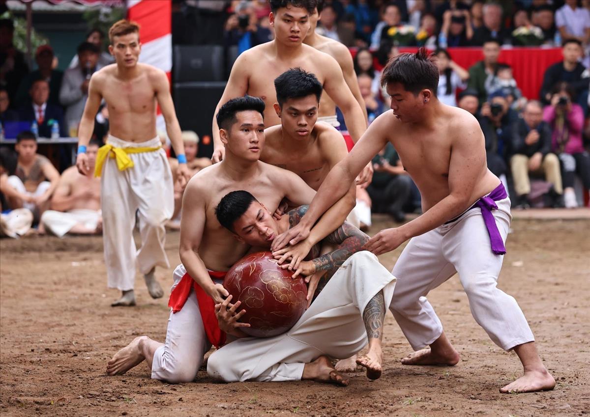 Pha tranh cầu giằng co quyết liệt giữa các đội thi. Ảnh: Minh Đức – TTXVN