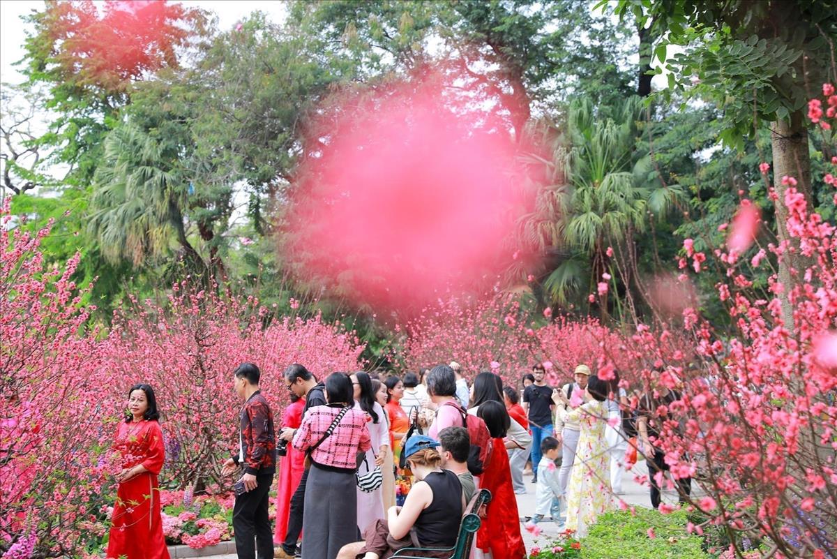 Sắc Xuân rực rỡ tại khu vực xung quanh Hồ Hoàn Kiếm thu hút sự quan tâm của du khách. Ảnh: Khánh Hoà - TTXVN