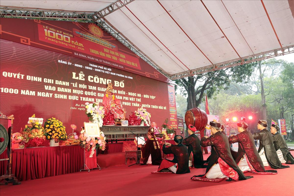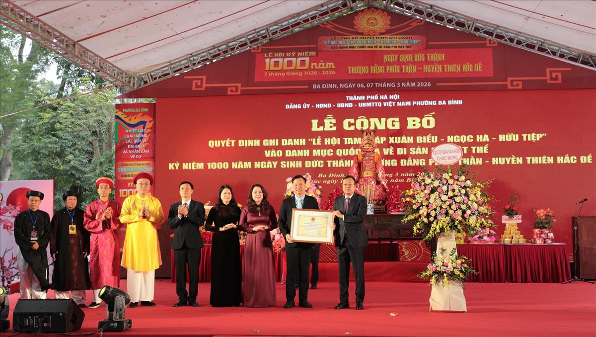 Sáng 7/3/2026, tại đền Núi Sưa, phường Ba Đình (Hà Nội) đã tổ chức Lễ công bố quyết định ghi danh Lễ hội Tam giáp (Xuân Biểu - Ngọc Hà - Hữu Tiệp) vào danh mục quốc gia Di sản văn hóa phi vật thể và kỷ niệm 1.000 năm Ngày sinh Thượng Đẳng Phúc Thần Huyền Thiên Hắc Đế.