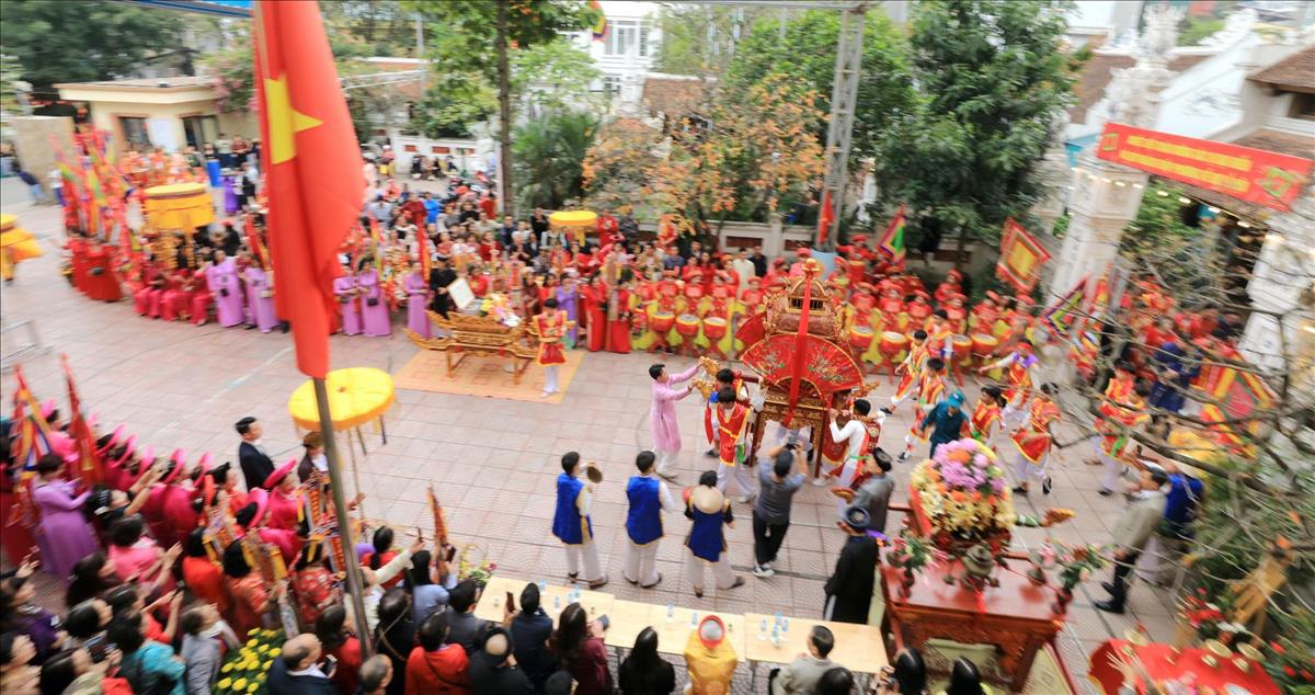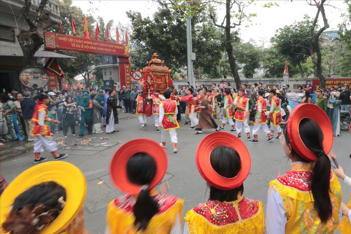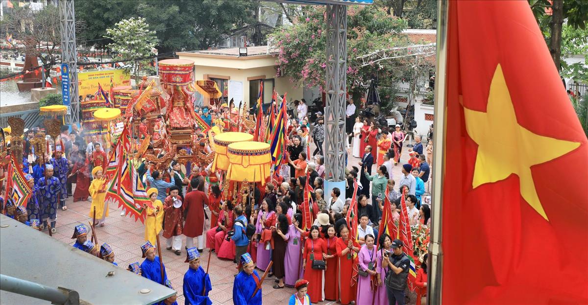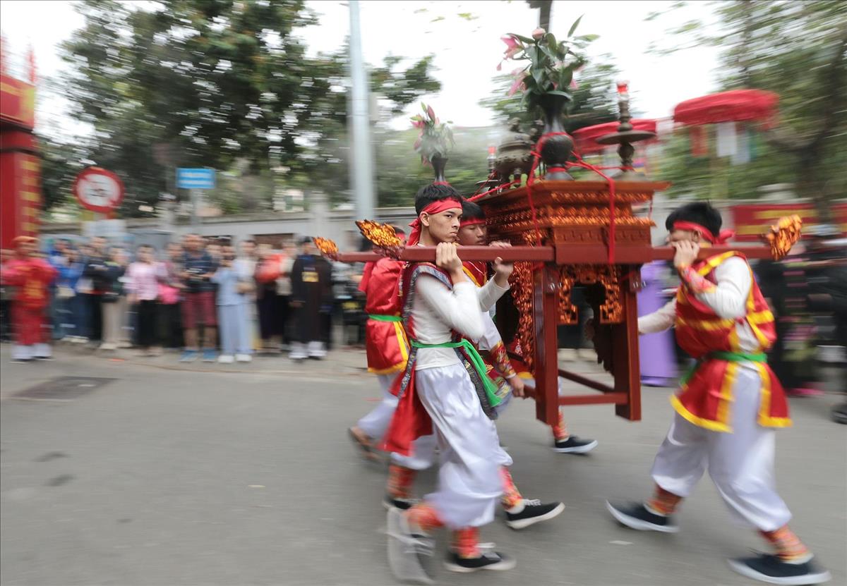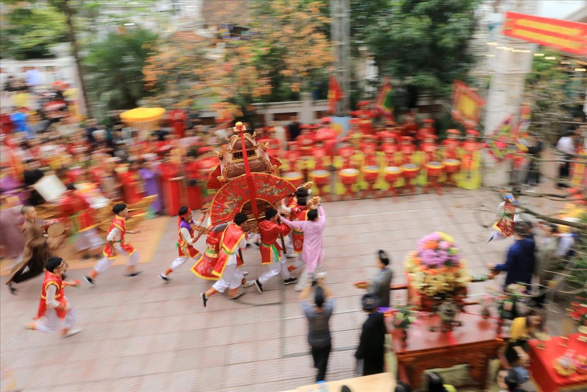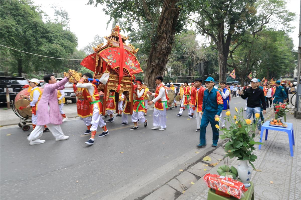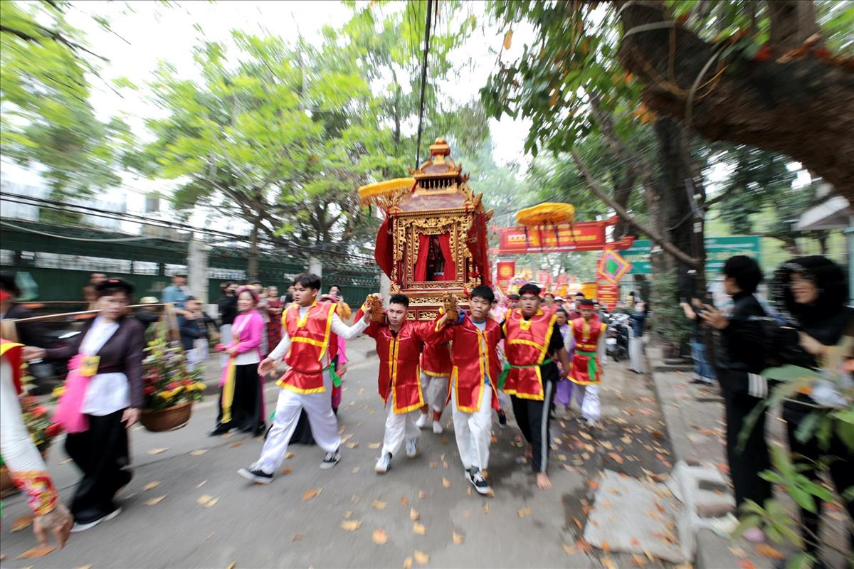 Màn rước kiệu xuyên qua những con ngõ nhỏ của làng hoa cổ, giữa tiếng trống cái giòn giã và tiếng hò reo cổ vũ của hàng ngàn người dân. Hình ảnh chiếc kiệu sơn son thiếp vàng rực rỡ dưới tiết trời xuân, xoay vần giữa sắc cờ hội ngũ hành, tạo nên một bức tranh ấn tượng, nơi quá khứ và hiện tại giao thoa một cách mãnh liệt.