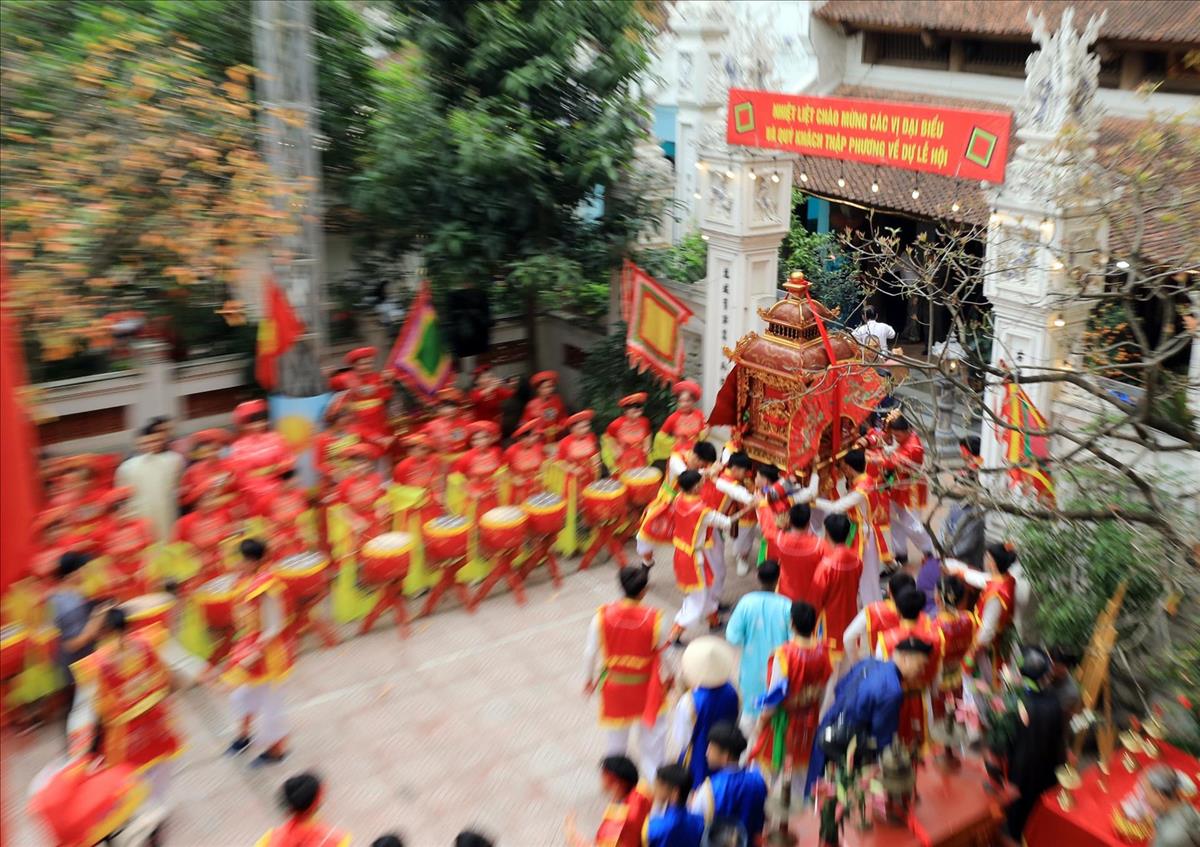 Sắc màu của dàn trống hội hòa quyện cùng chuyển động mạnh mẽ của kiệu Thánh tạo nên bức tranh hội xuân rực rỡ.