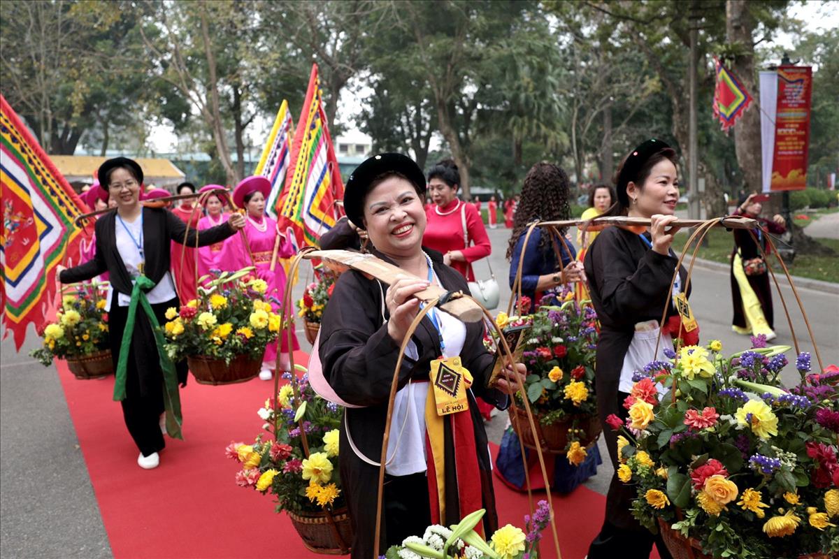 Những người dân Ngọc Hà vui tươi với những gánh hoa trên vai tham dự lễ hội.
