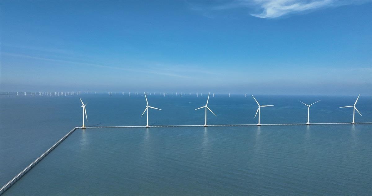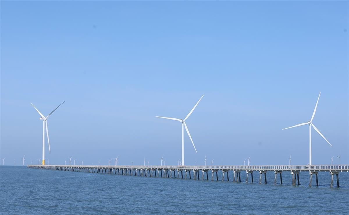 Hệ thống trụ tua bin phát điện ngoài khơi của Nhà máy điện gió Hoà Bình 1 + 2 (Công ty TNHH Đầu tư Xây dựng và Thương mại Phương Anh), ở xã Vĩnh Hậu, tỉnh Cà Mau. Ảnh: Vũ Sinh – TTXVN
