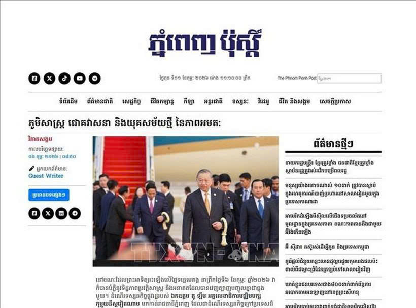 Nhân chuyến thăm cấp Nhà nước của Tổng Bí thư Đảng Cộng sản Việt Nam Tô Lâm và Đoàn đại biểu cấp cao Việt Nam tới Vương quốc Campuchia ngày 6/2 vừa qua, tờ Phnom Penh Post mới đây đã đăng bài bình luận của Phó Giáo sư, Tiến sĩ Neak Chandarith, Viện trưởng Viện Nghiên cứu Quốc tế và Chính sách Công thuộc Đại học Hoàng gia Phnom Penh (RUPP), đánh giá ý nghĩa của chuyến thăm đối với quan hệ hai nước trong bối cảnh mới.