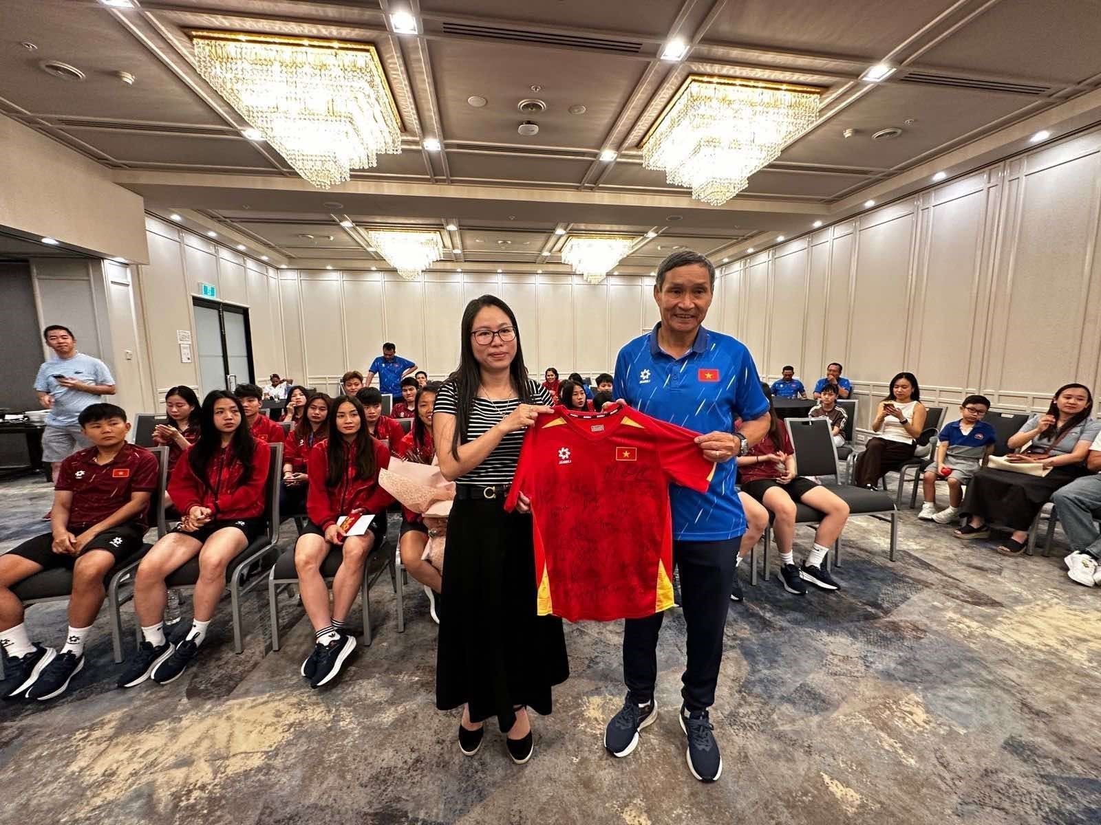 Huấn luyện viên Mai Đức Chung (phải) tặng áo thi đấu có chữ ký của các cầu thủ đội tuyển cho Tổng Lãnh sự Nguyễn Thanh Hà. Ảnh: Thanh Tú - TTXVN tại Australia