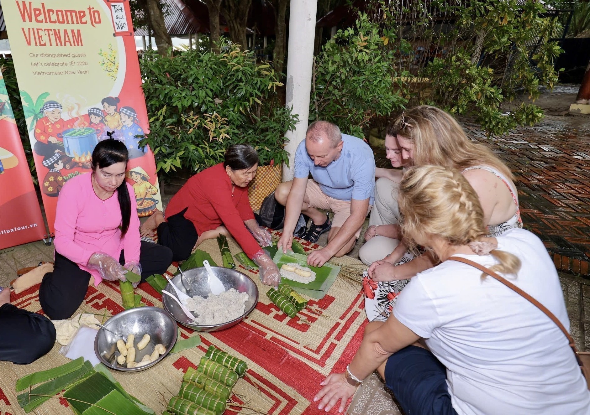 Khách nước ngoài trải nghiệm gói bánh Tét. Ảnh: Mỹ Phương/TTXVN