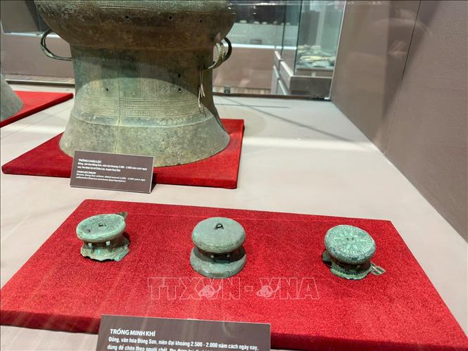 Chiếc trống đồng Làng Vạc thuộc nền văn hóa Đông Sơn, có niên đại từ thế kỷ III đến thế kỷ I trước Công nguyên hiện được lưu giữ tại Bảo tàng Nghệ An – Xô viết Nghệ Tĩnh. Ảnh: TTXVN phát