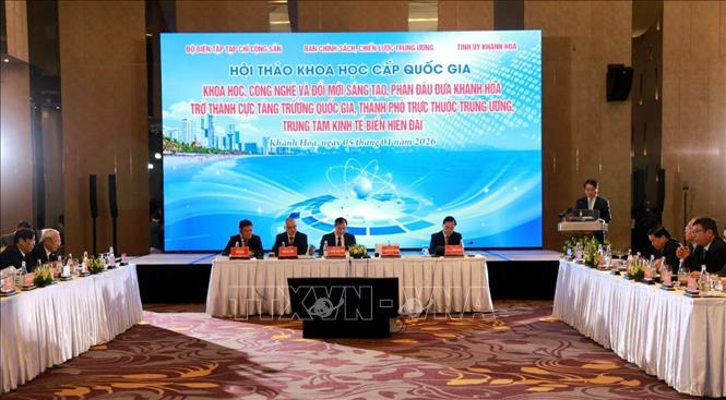 Quang cảnh hội thảo khoa học cấp quốc gia với chủ đề "Khoa học, công nghệ và đổi mới sáng tạo, phấn đấu đưa Khánh Hòa trở thành cực tăng trưởng quốc gia, thành phố trực thuộc Trung ương, trung tâm kinh tế biển hiện đại". Ảnh: Xuân Triệu/TTXVN