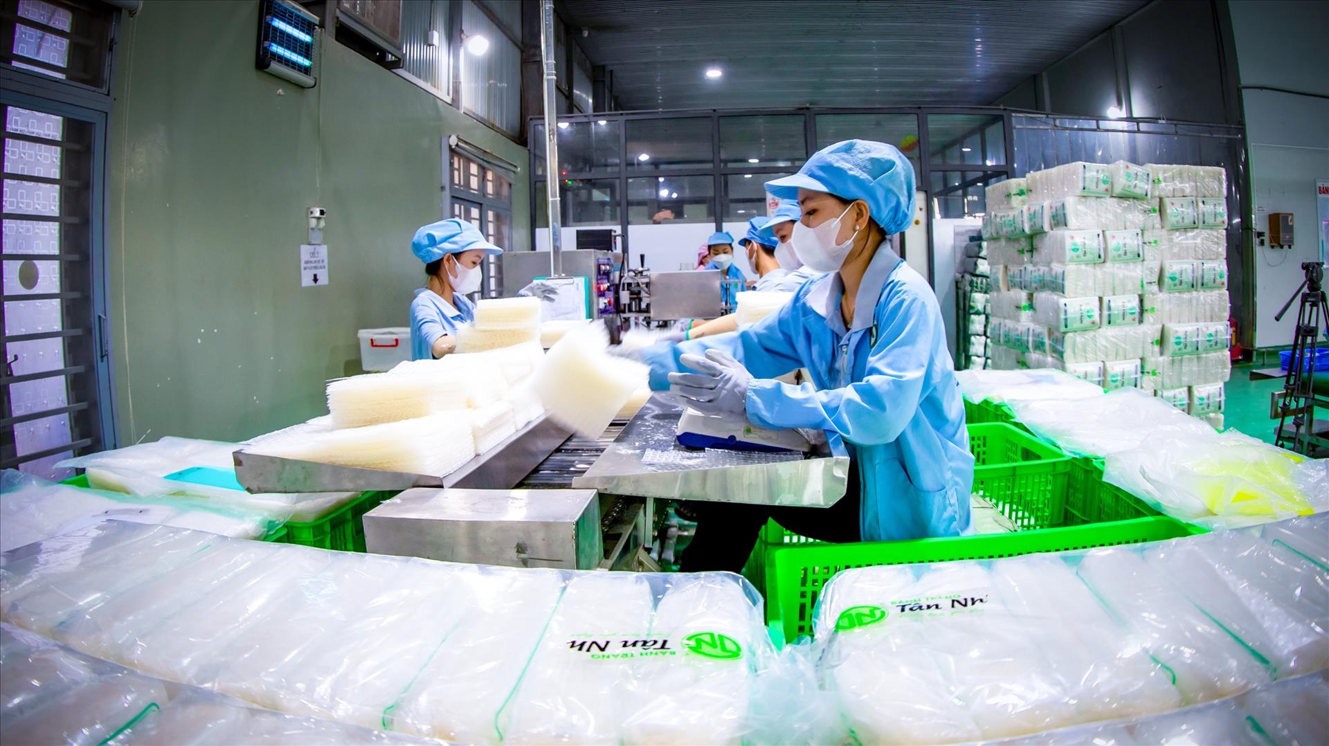 Bánh tráng Tây Ninh thành phẩm được đóng gói, dán nhãn tại Công ty TNHH Tân Nhiên, sẵn sàng phân phối trong và ngoài tỉnh dịp Tết. Ảnh: Minh Phú – TTXVN