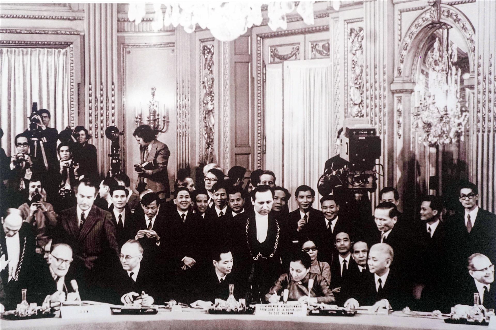 Hình ảnh về khoảnh khắc lịch sử tại Hội nghị Paris về Việt Nam (27/01/1973), khi bà Nguyễn Thị Bình đặt bút kí vào Hiệp định Paris. Ảnh: HPDF cung cấp