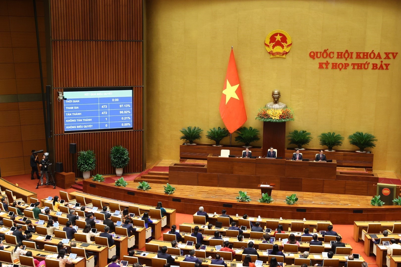 Kết quả biểu quyết: Đã có 472/473 đại biểu tham gia biểu quyết tán thành, chiếm 96,92% tổng số đại biểu Quốc hội đã thông qua Nghị quyết bầu chủ tịch nước Cộng hòa xã hội chủ nghĩa Việt Nam nhiệm kỳ 2021-2026 đối với ông Tô Lâm./.