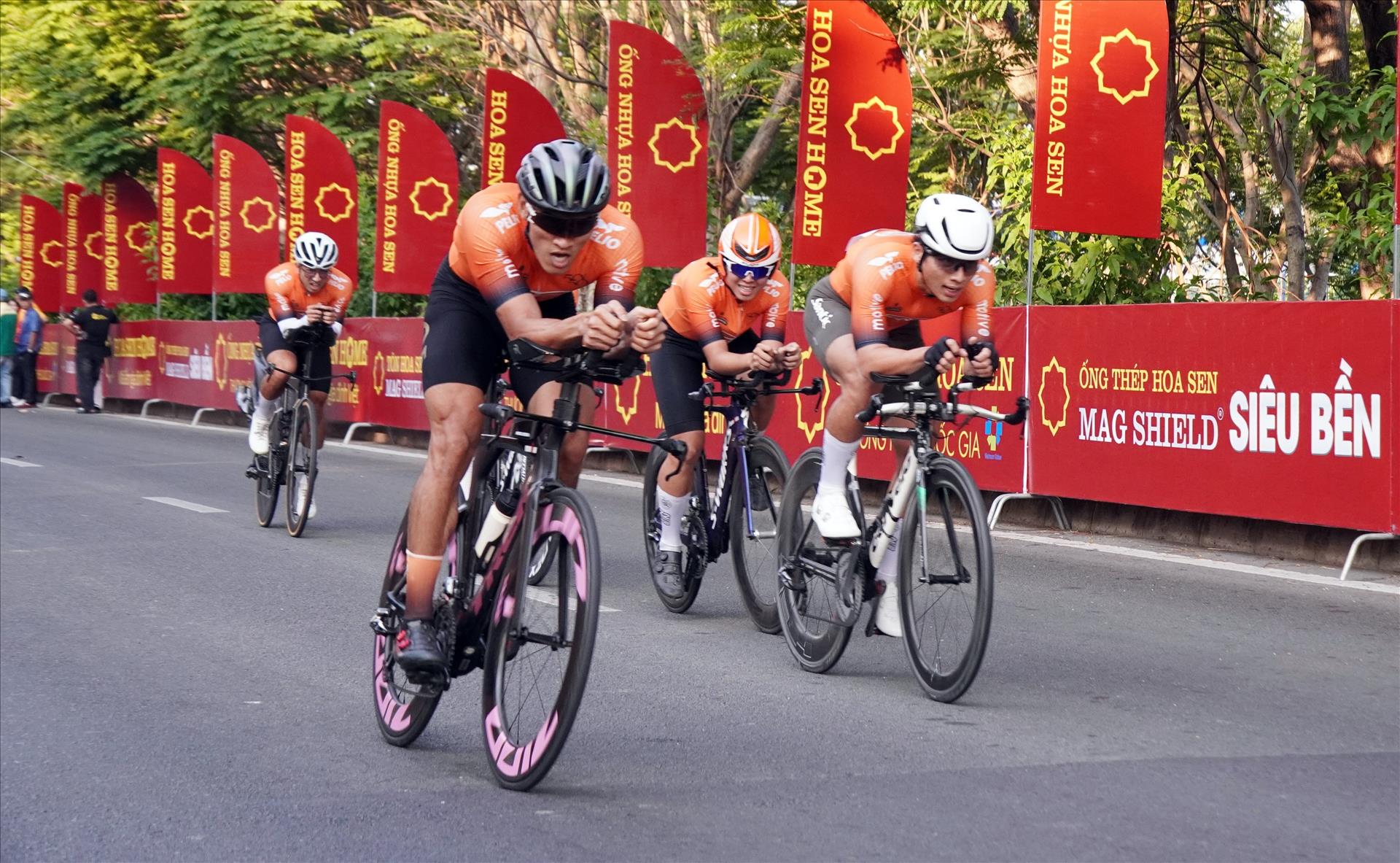 Các vận động viên thi đấu nội dung đua xe đạp đồng đội tính giờ nam. Ảnh: Trung Tuyến – TTXVN