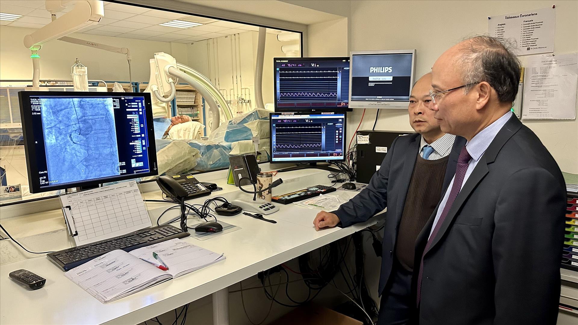 Đại sứ Đinh Toàn Thắng tham quan mô hình can thiệp tim bằng phương pháp nội soi tại bệnh viện Pierre Beregovoy. Ảnh: Thu Hà - P/v TTXVN tại Pháp