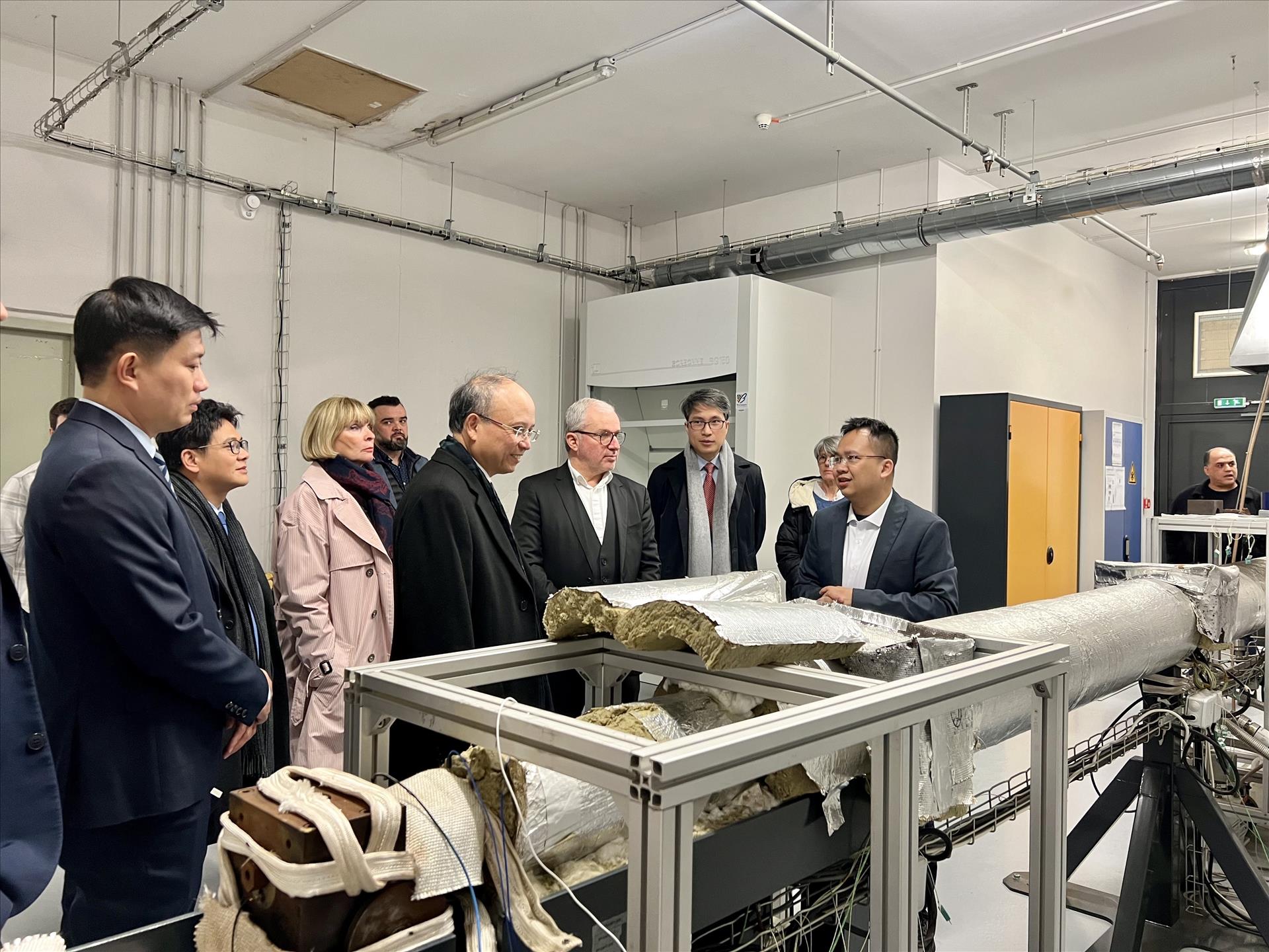 Đại sứ Đinh Toàn Thắng tham quan phòng đào tạo bằng không gian mô phỏng tại Học viện đào tạo cơ khí ô tô và vận tải (ISAT). Ảnh: Thu Hà - P/v TTXVN tại Pháp