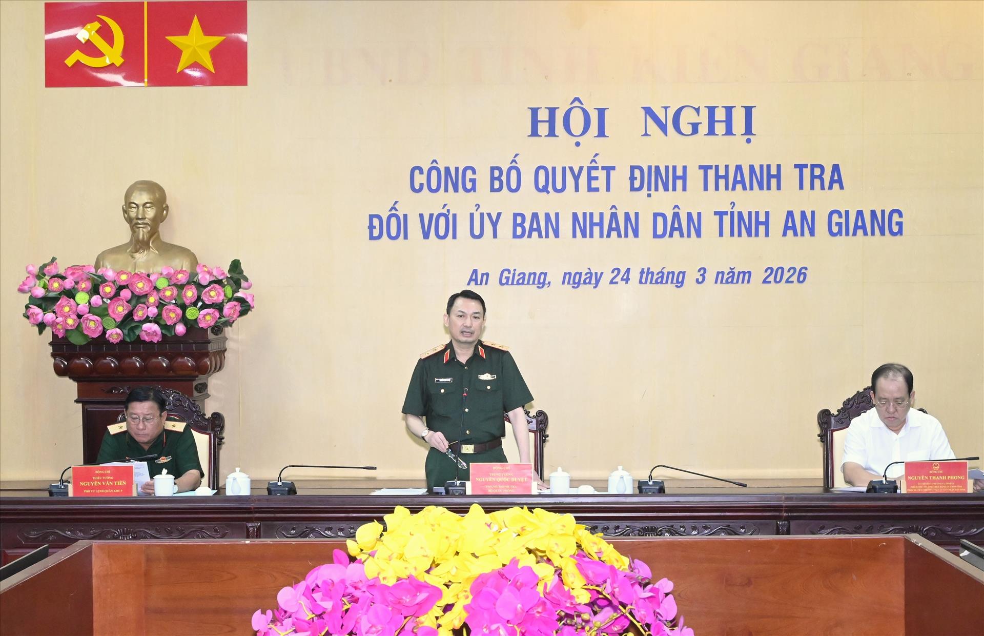 Ngày 24/3, tại trụ sở UBND tỉnh An Giang, Thanh tra Bộ Quốc phòng tổ chức Hội nghị công bố Quyết định thanh tra việc thực hiện chính sách, pháp luật của Nhà nước và quy định của Bộ Quốc phòng về nhiệm vụ quốc phòng, quân sự trên địa bàn tỉnh.