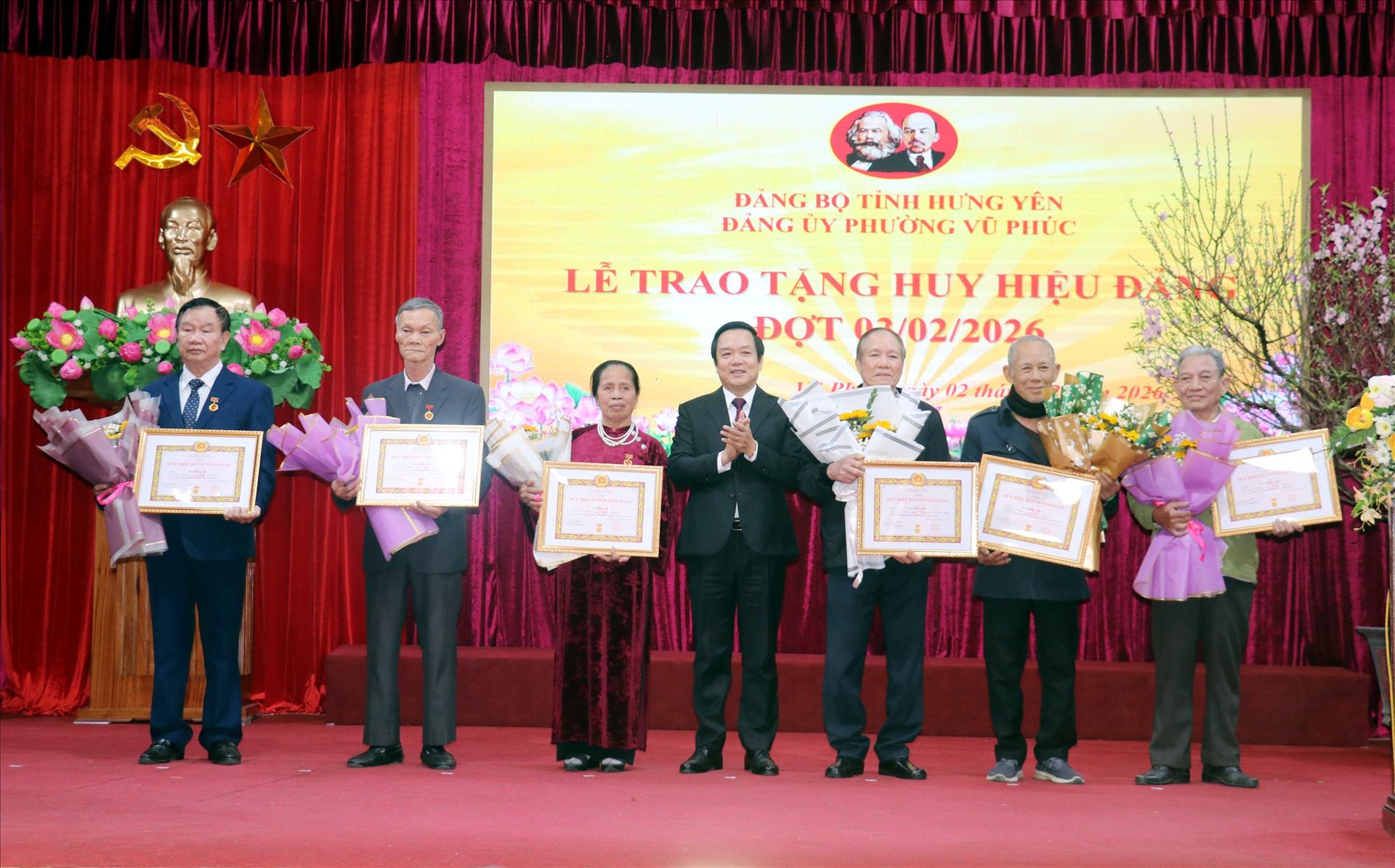 *Tại Hưng Yên, thực hiện sự chỉ đạo của Ban Thường vụ Tỉnh ủy Hưng Yên, chiều 2/2, Đảng ủy phường Vũ Phúc (tỉnh Hưng Yên) tổ chức Lễ trao tặng Huy hiệu Đảng đợt 3/2/2026. Ủy viên Trung ương Đảng, Phó Bí thư Tỉnh ủy, Chủ tịch Ủy ban nhân dân tỉnh Hưng Yên Phạm Quang Ngọc dự và trao Huy hiệu Đảng cho các đồng chí đảng viên được tặng Huy hiệu Đảng.