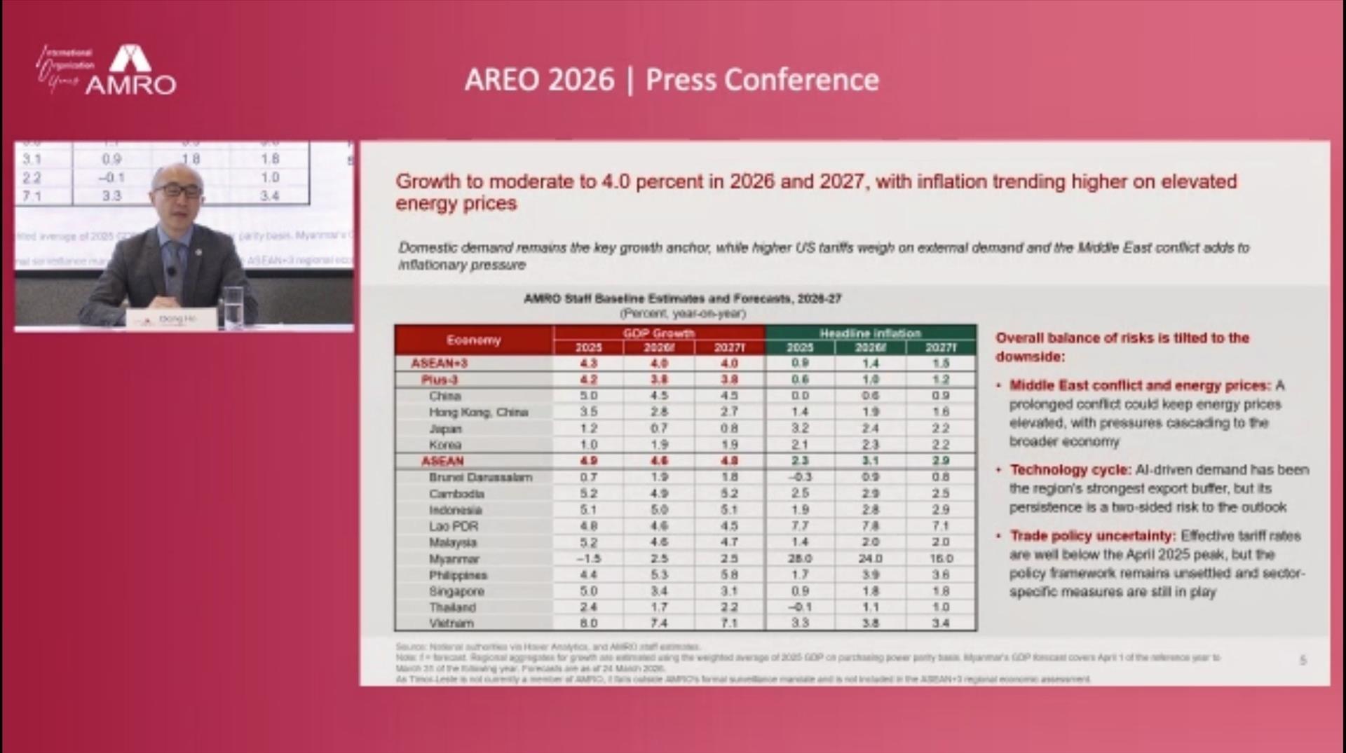 Báo cáo AREO dự báo tăng trưởng GDP thực của Việt Nam năm 2026 là 7,4% và năm 2027 là 7,1%. Lạm phát toàn phần của Việt Nam năm 2026 là 3,8% và năm 2027 là 3,4%. Theo ông Dong He, mặc dù dự báo tốc độ tăng trưởng kinh tế của Việt Nam giảm so với mức 8% của năm ngoái, nhưng ông vẫn kỳ vọng vào sức chống chịu và khả năng bứt phá của Việt Nam.