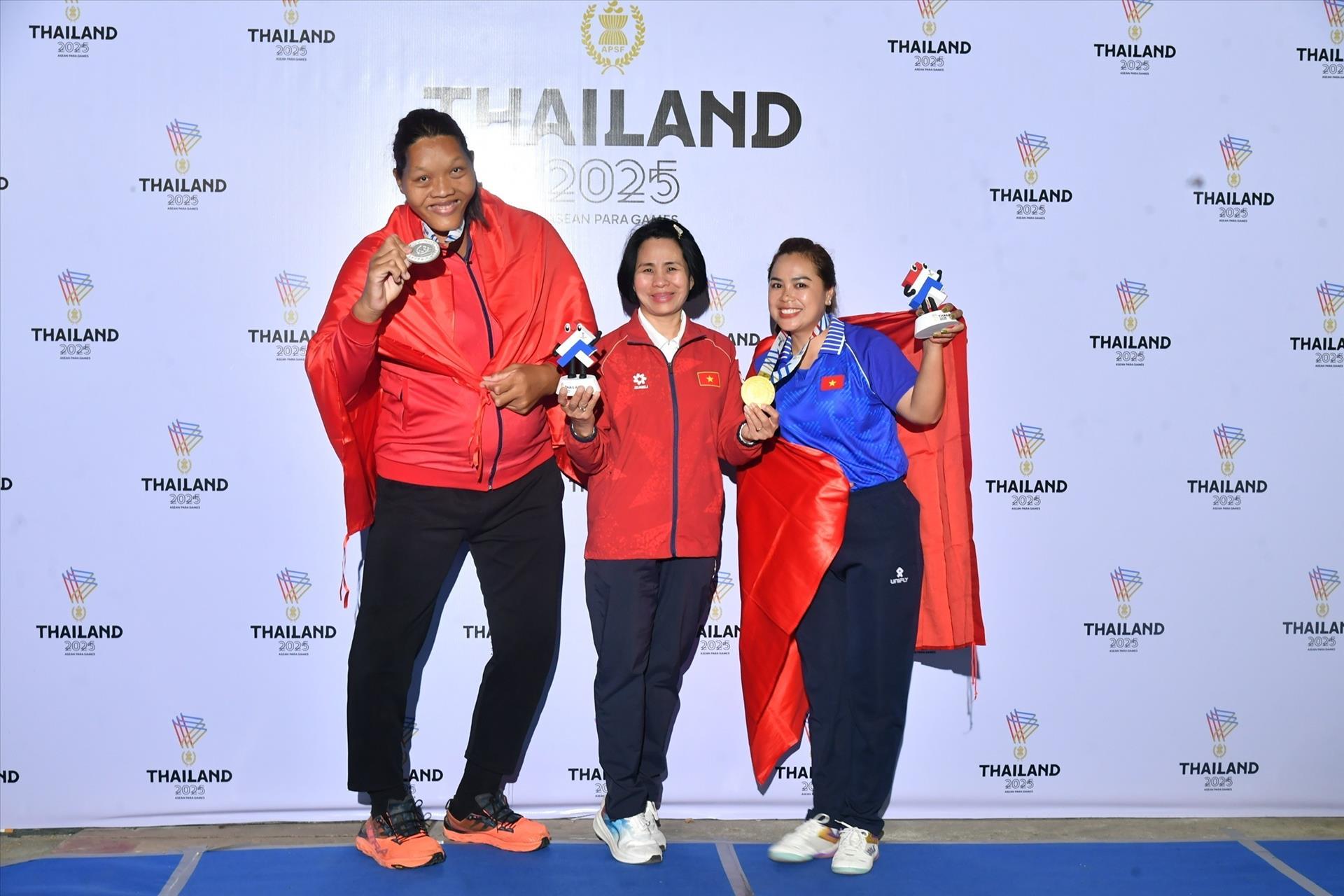 Trưởng đoàn Lê Thị Hoàng Yến (giữa) chia vui với hai vận động viên giành HCV và HCB môn Ném đĩa F57. Ảnh: TTXVN phát