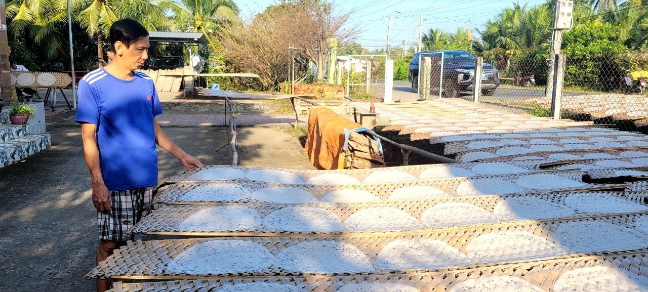 Làng nghề bánh tráng Mỹ Lồng ở ấp Nghĩa Huấn, xã Mỹ Thạnh, huyện Giồng Trôm, tỉnh Bến Tre vào vụ Tết. Ảnh: Công Trí-TTXVN