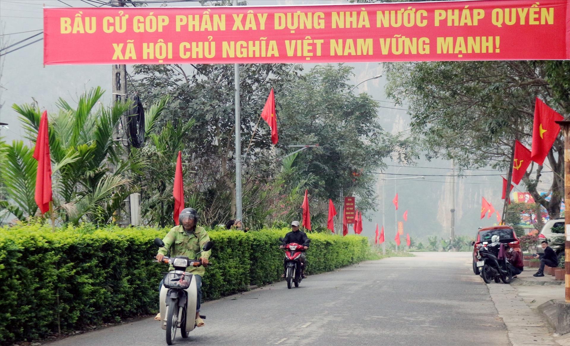 Tuyến đường tại phường Tam Chúc được trang trí rực rỡ để chào mừng ngày bầu cử. Ảnh: Nguyễn Chinh - TTXVN