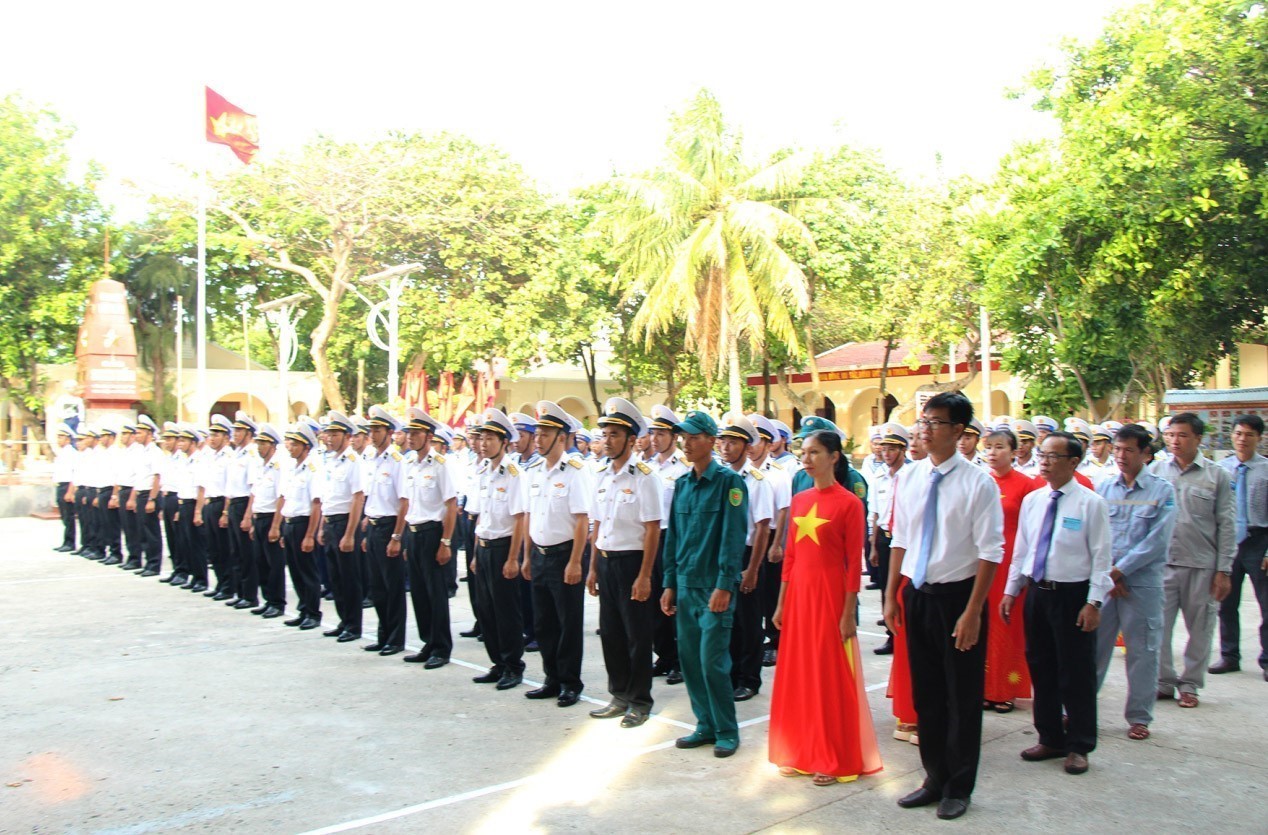 Các cử tri trên đảo Sinh Tồn tham dự lễ chào cờ bầu cử ở đảo Sinh Tồn, sáng 8/3. Ảnh: TTXVN phát