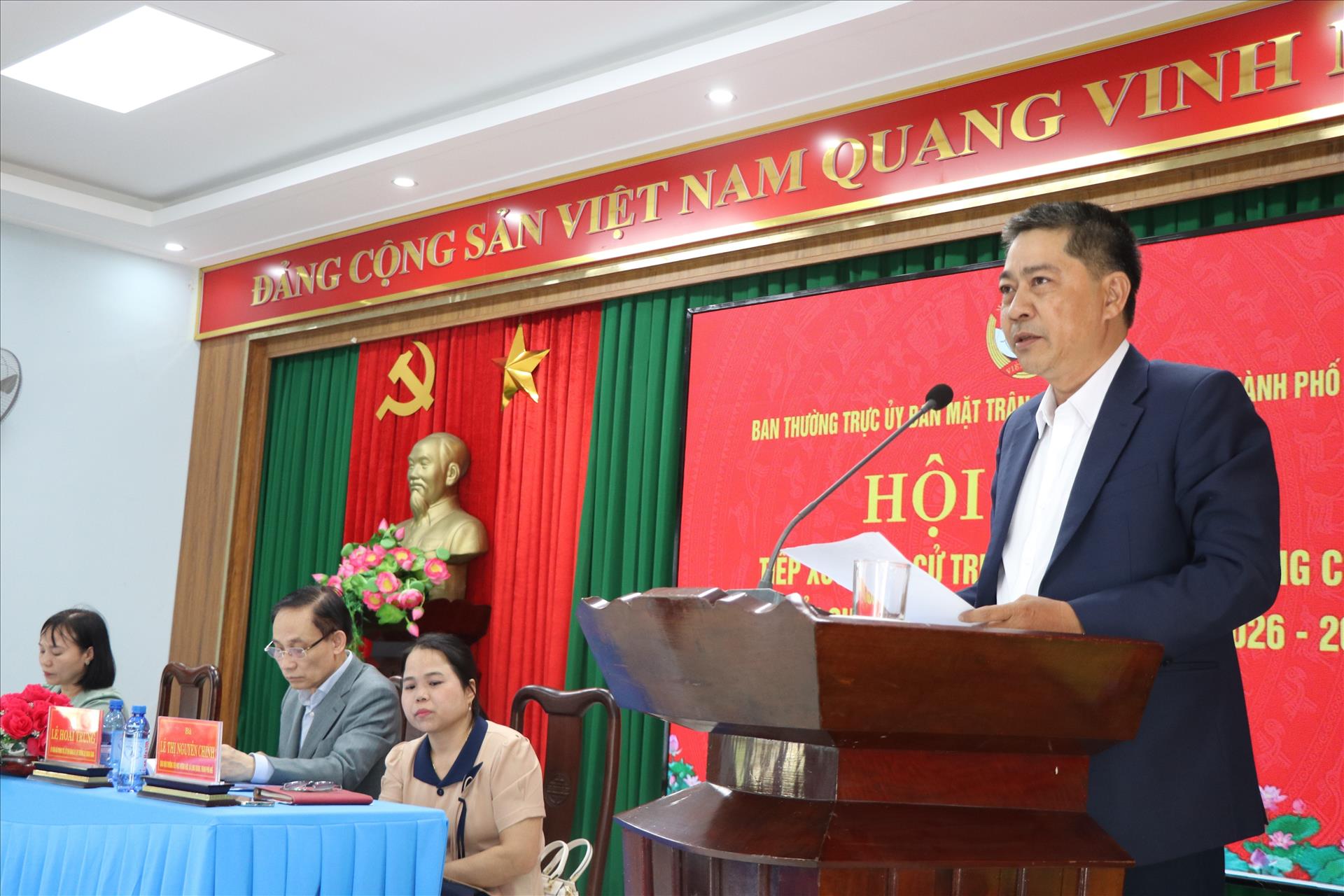 Ông Nguyễn Tiến Nam Phó Chủ tịch Uỷ ban Mặt trận Tổ quốc Việt Nam thành phố Huế, ứng cử đại biểu Quốc hội nhiệm kỳ 2026-2031 trình bày chương trình hành động. Ảnh: Mai Trang - TTXVN