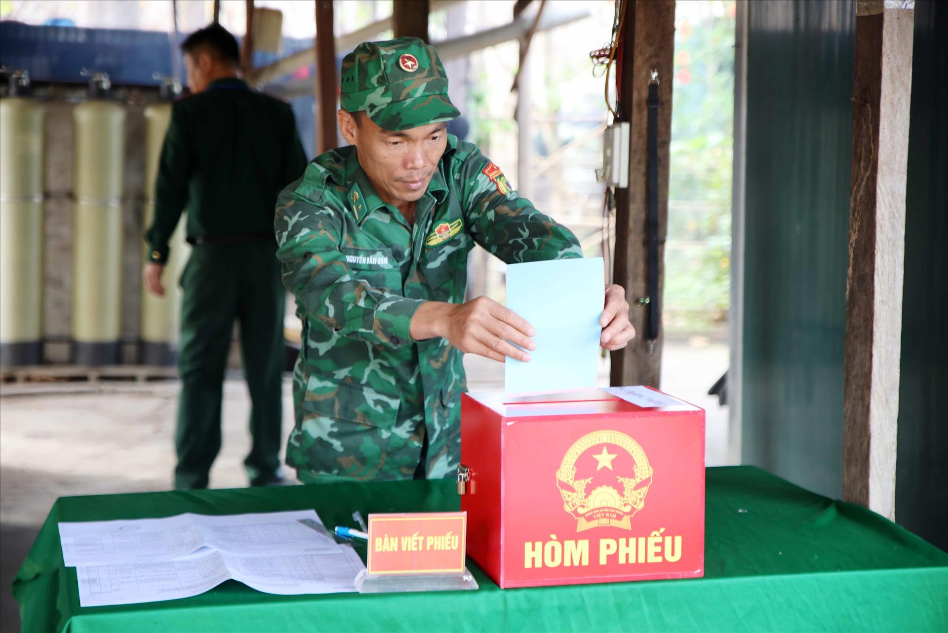 Cử tri Đồn Biên phòng Sê Rê Pốk thực hiện việc bầu cử sớm. Ảnh: TTXVN phát