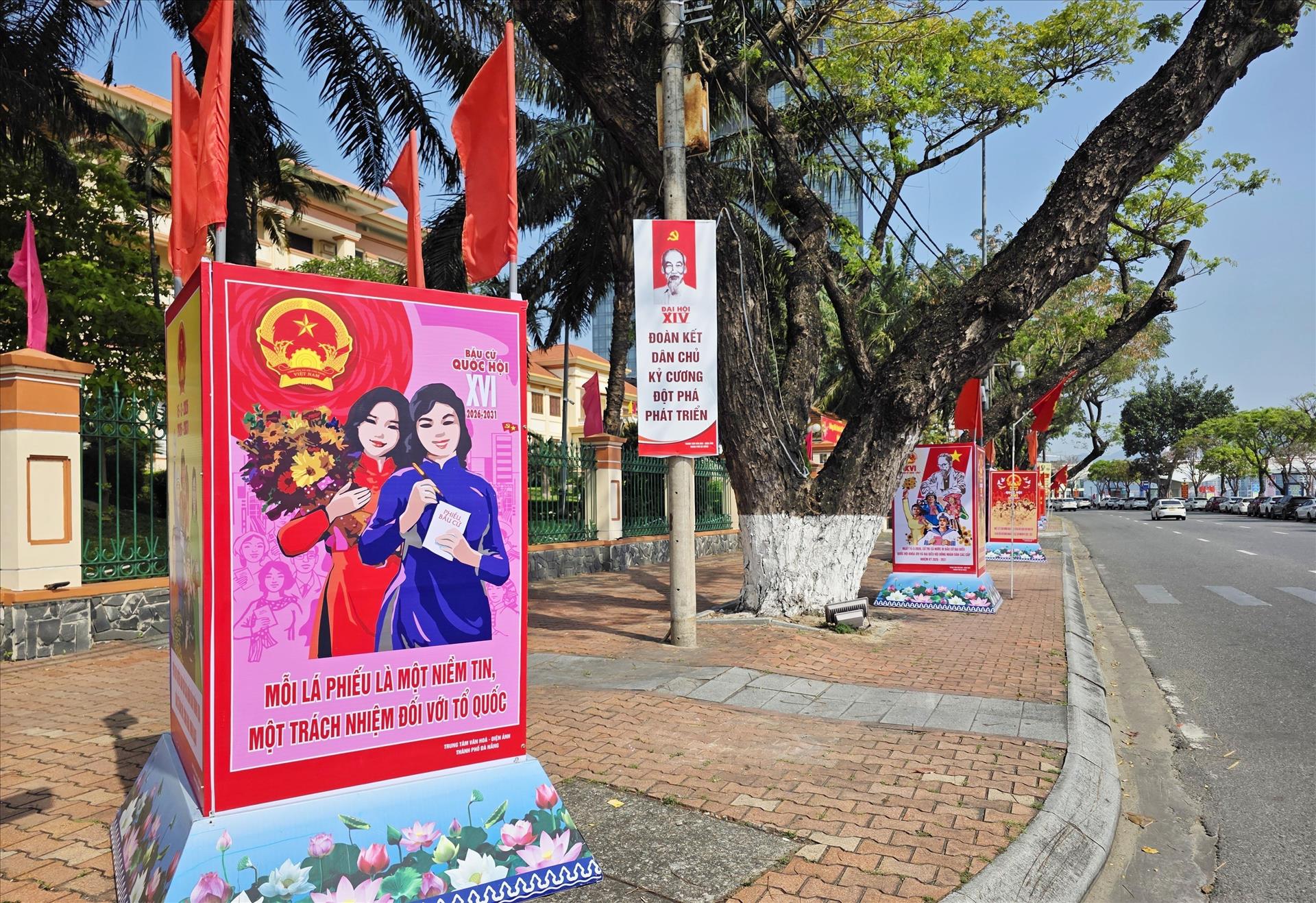 Các pa nô tuyên truyền được trang trí trang trọng tại khu trung tâm thành phố. Ảnh: Trần Lê Lâm - TTXVN