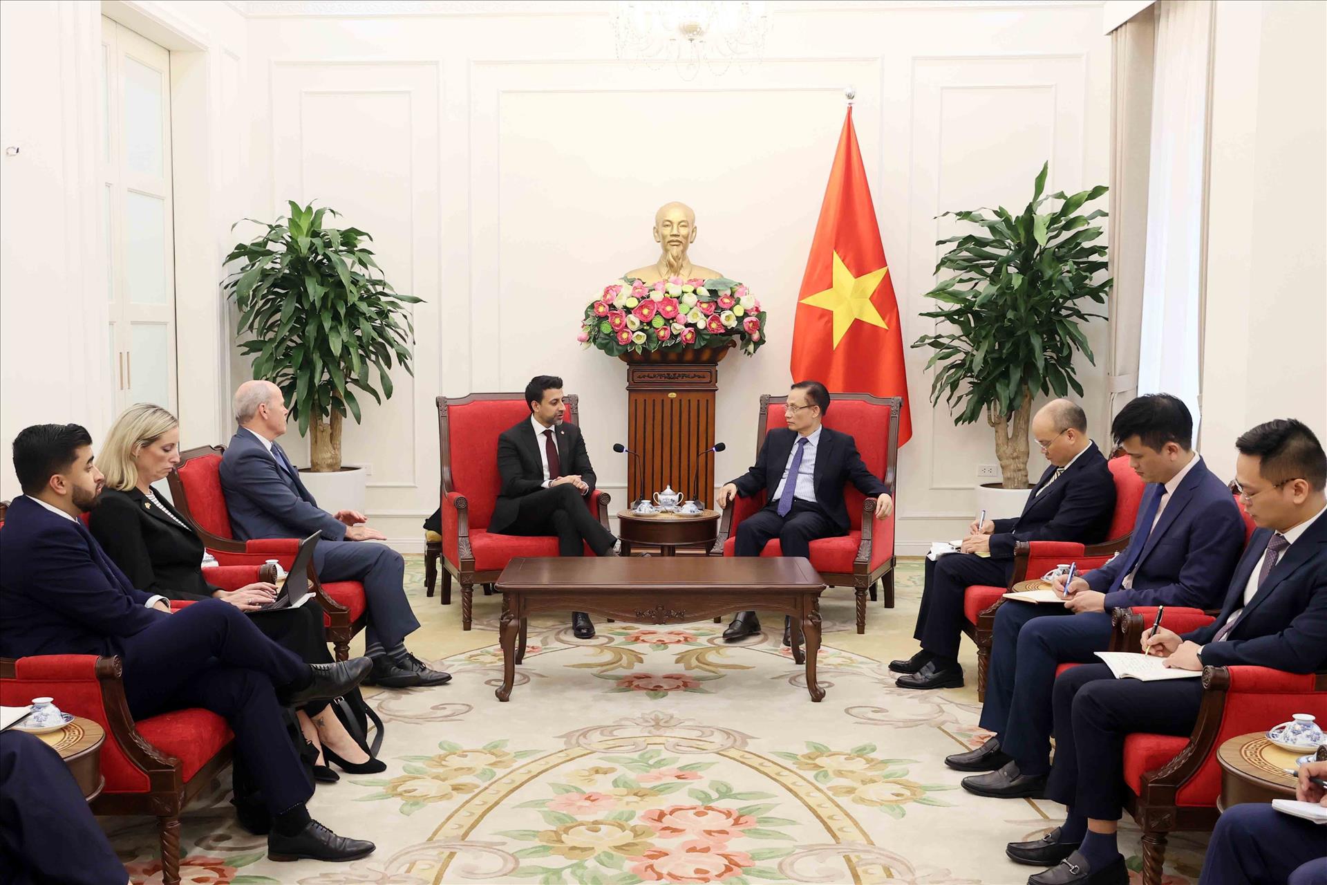 Bộ trưởng Bộ Ngoại giao Lê Hoài Trung tiếp Bộ trưởng Bộ Thương mại Quốc tế Canada Maninder Sidhu. Ảnh: An Đăng - TTXVN