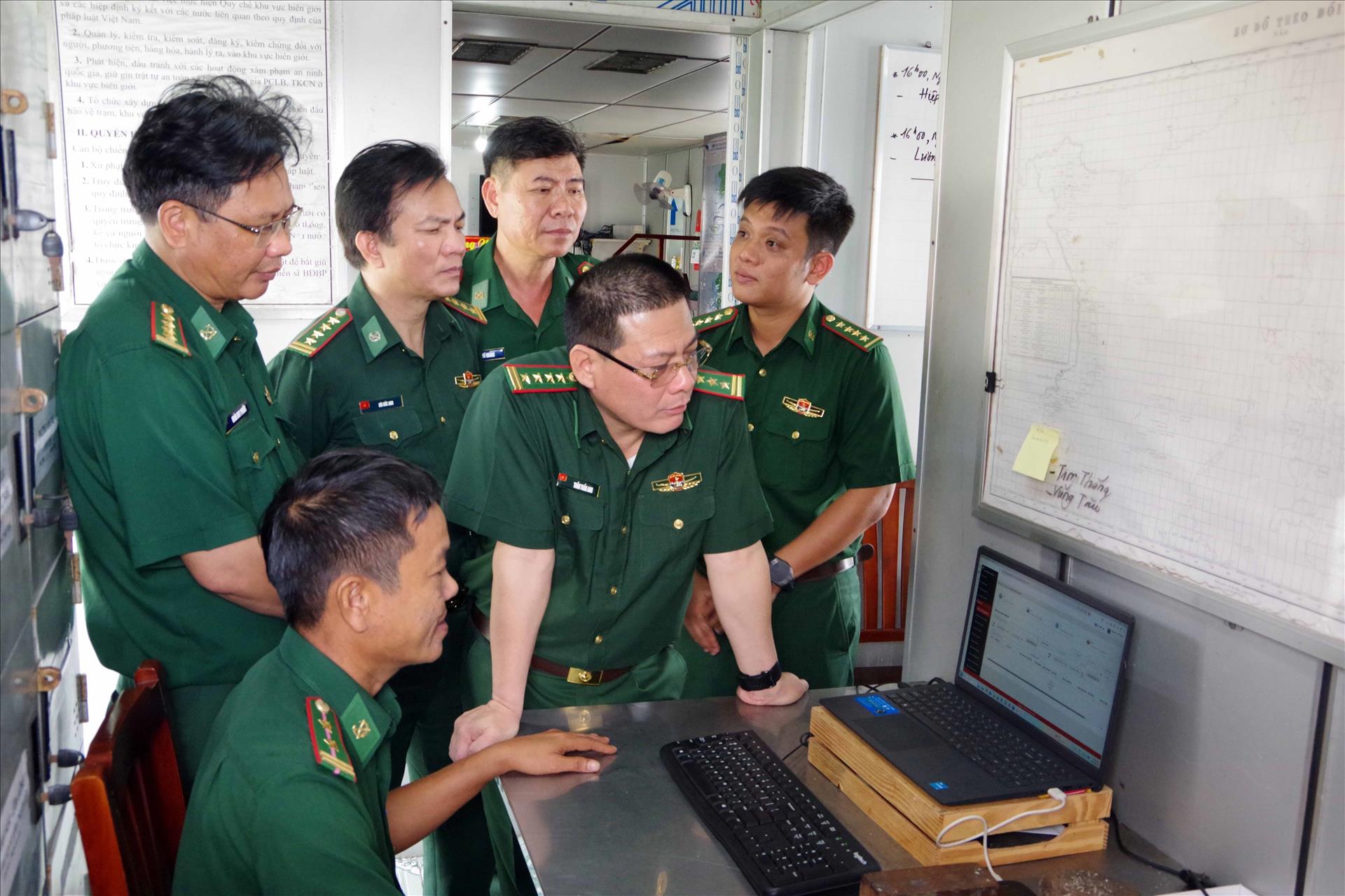 Đoàn công tác kiểm tra hệ thống quản lý, kiểm soát tàu cá tại trạm Kiểm soát Biên phòng Bến Đá. Ảnh: TTXVN phát