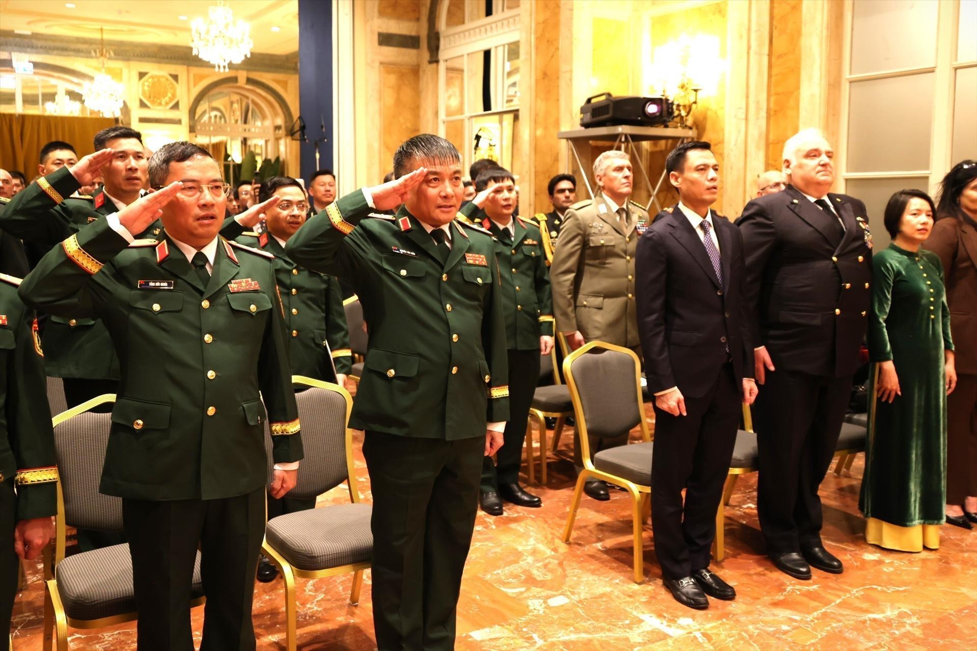 Các đại biểu tham dự buổi khai trương Văn phòng Tùy viên Quốc phòng Việt Nam tại Italy làm lễ chào cờ. Ảnh: Thanh Hải - PV TTXVN tại Italy