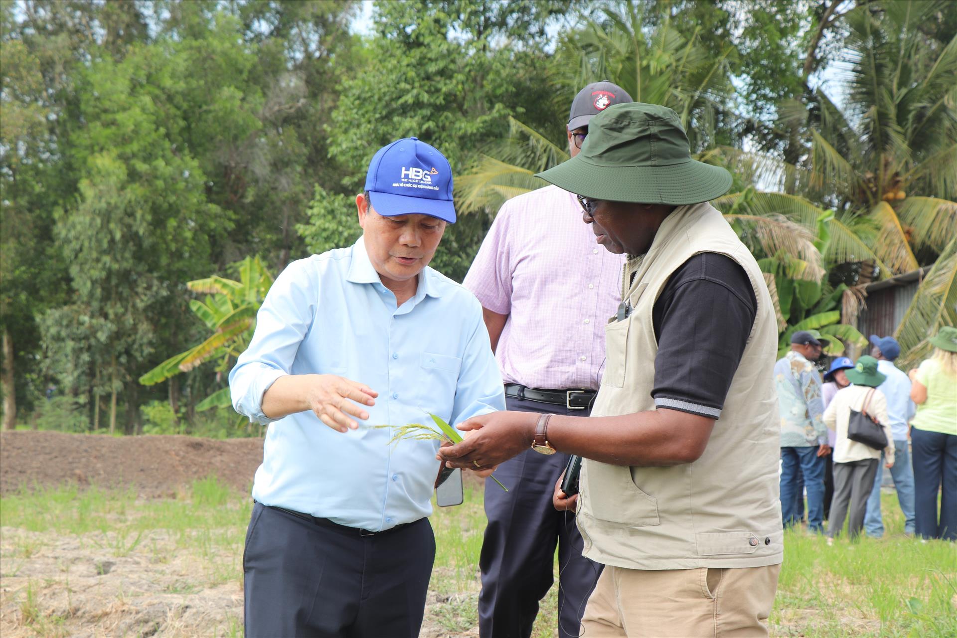 Bộ trưởng Bộ Nông nghiệp Zambia Reuben Mtolo Phiri (đầu tiên, bên trái) tìm hiểu về giống lúa OM19 được trồng tại Hợp tác xã Tiến Thuận. Ảnh: Thu Hiền - TTXVN