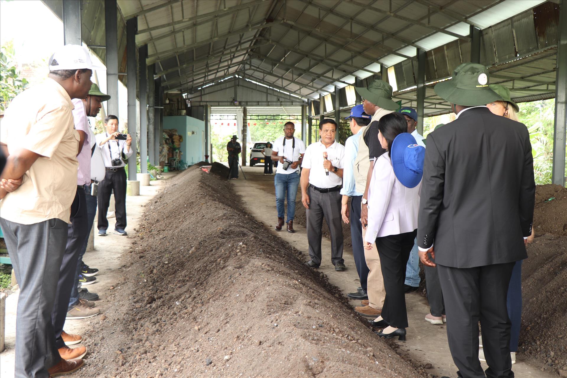 Ông Nguyễn Cao Khải, Giám đốc Hợp tác xã Tiến Thuận giới thiệu mô hình sản xuất phân hữu cơ để trồng lúa cho Đoàn Zambia. Ảnh: Thu Hiền - TTXVN