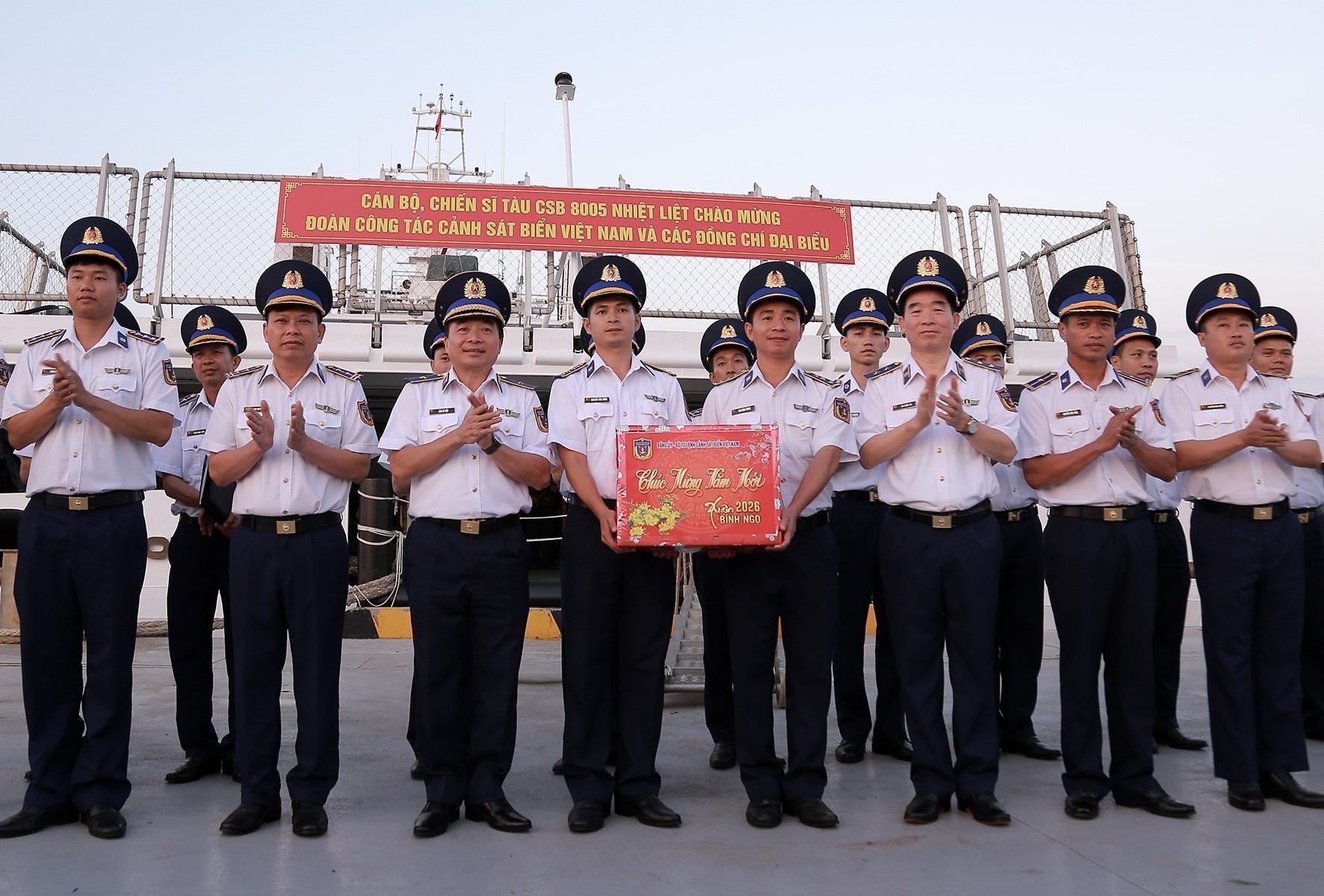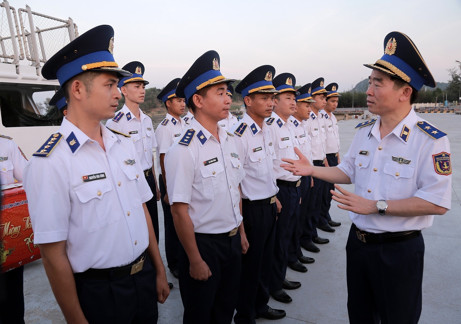 Trung tướng Bùi Quốc Oai, Bí thư Đảng uỷ, Chính uỷ Cảnh sát biển Việt Nam tặng quà chúc Tết cán bộ, chiến sĩ Tàu CSB 8005. Ảnh: TTXVN phát