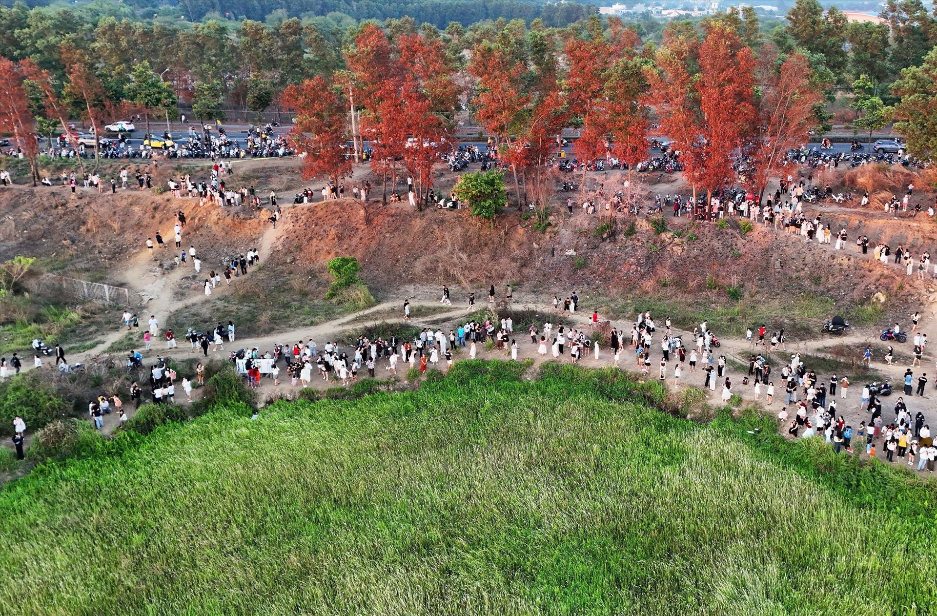Rất đông người dân, nhất là các bạn trẻ đổ về cánh đồng cỏ lau ở Làng Đại học Thủ Đức để chụp ảnh và ngắm Mặt Trời “trứng muối”.