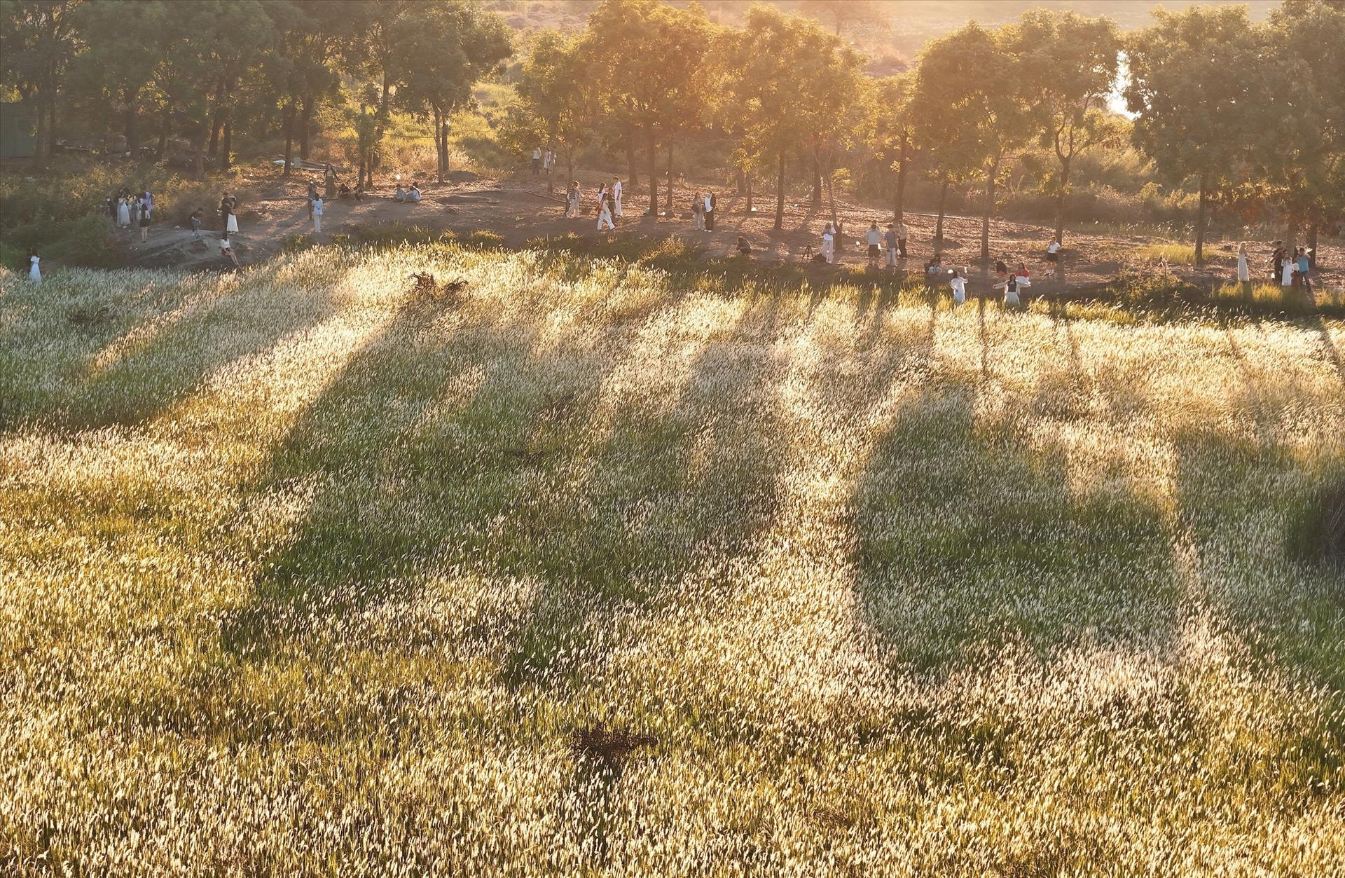 Khung giờ từ 17 - 18 giờ là “thời điểm vàng” để chụp ảnh, khi ánh hoàng hôn nhuộm vàng cả cánh đồng cỏ lau.