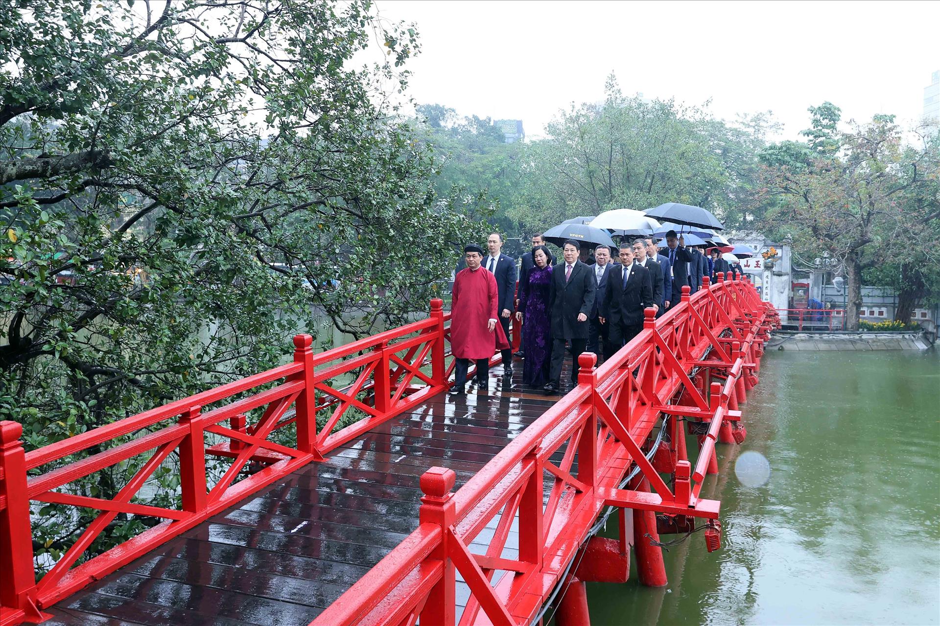 Chủ tịch nước Lương Cường và Phu nhân cùng các đại biểu tham quan Đền Ngọc Sơn. Ảnh: An Đăng - TTXVN