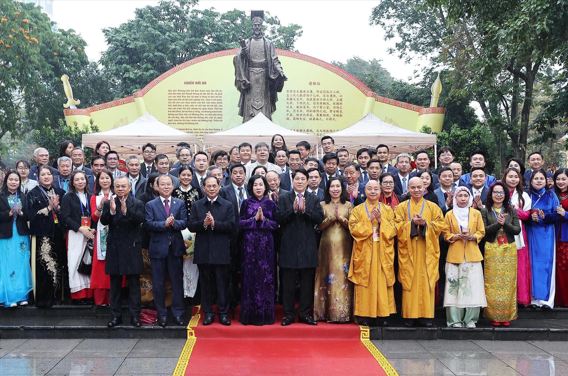 Chủ tịch nước Lương Cường và Phu nhân cùng các đại biểu trước tượng đài Vua Lý Thái Tổ. Ảnh: Lâm Khánh - TTXVN