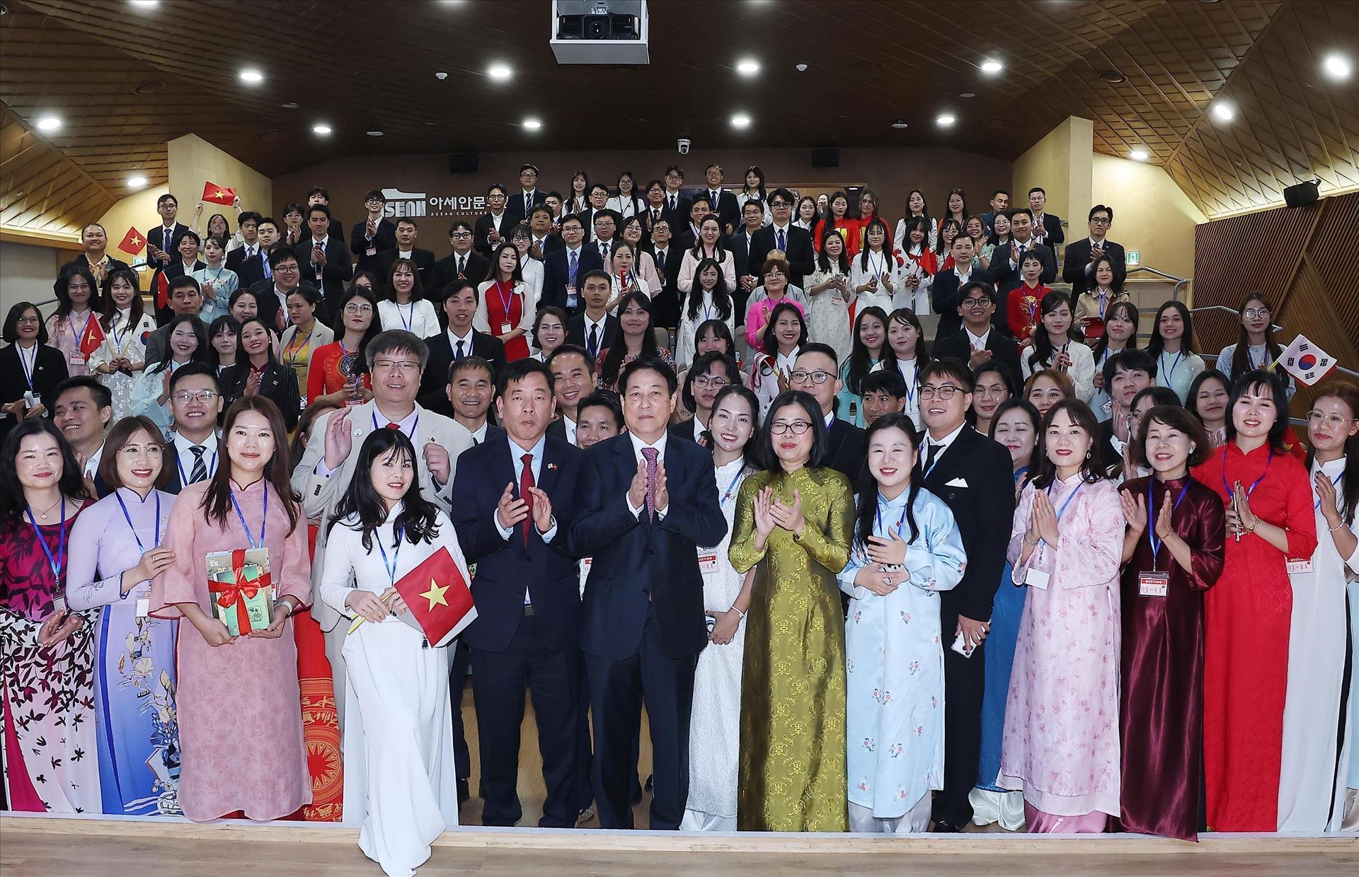 Chủ tịch nước Lương Cường với cán bộ, nhân viên các cơ quan đại diện Việt Nam tại Hàn Quốc và Cộng đồng người Việt Nam tại Đông Nam Hàn Quốc. Ảnh: Lâm Khánh – TTXVN