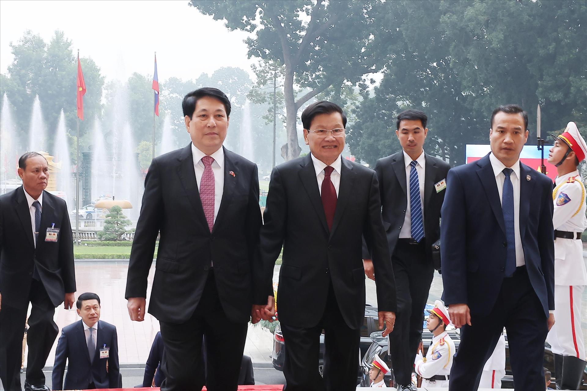 Chủ tịch nước Lương Cường đón Tổng Bí thư, Chủ tịch nước Lào Thongloun Sisoulith. Ảnh: Lâm Khánh – TTXVN
